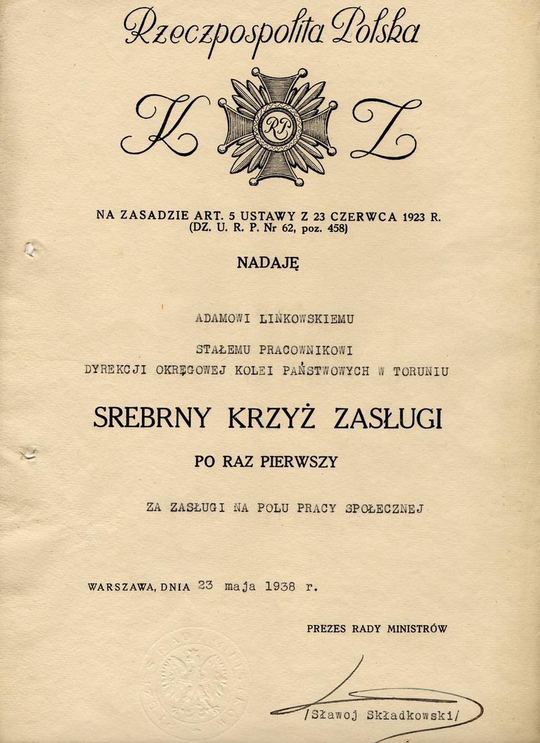 Krzyż Zasługi ustanowiono jako odznaczenie trójklasowe na mocy ustawy z dnia 23 czerwca 1923r. Jakkolwiek od początku w polskim systemie odznaczeń postrzegano krzyże jako osobną względem orderów i medali kategorię odznaczeń, nawet w oficjalnych dokumentach możemy znaleźć sformułowanie „Order Krzyża Zasługi”. Chociaż była to nazwa niepoprawna, przewija się w dokumentach przez cały okres przedwojenny, ale także w czasie wojny. Na terytorium Polski nazwa ta zanikła wkrótce po wojnie – ostatnimi znanymi mi dokumentami, na których występuje są zaświadczenia tymczasowe o odznaczeniu z 1946r., w wersji na której widniała formułka „odznaczony orderem, medalem” najczęściej w przypadku Krzyży Zasługi wykreślano „medalem”.