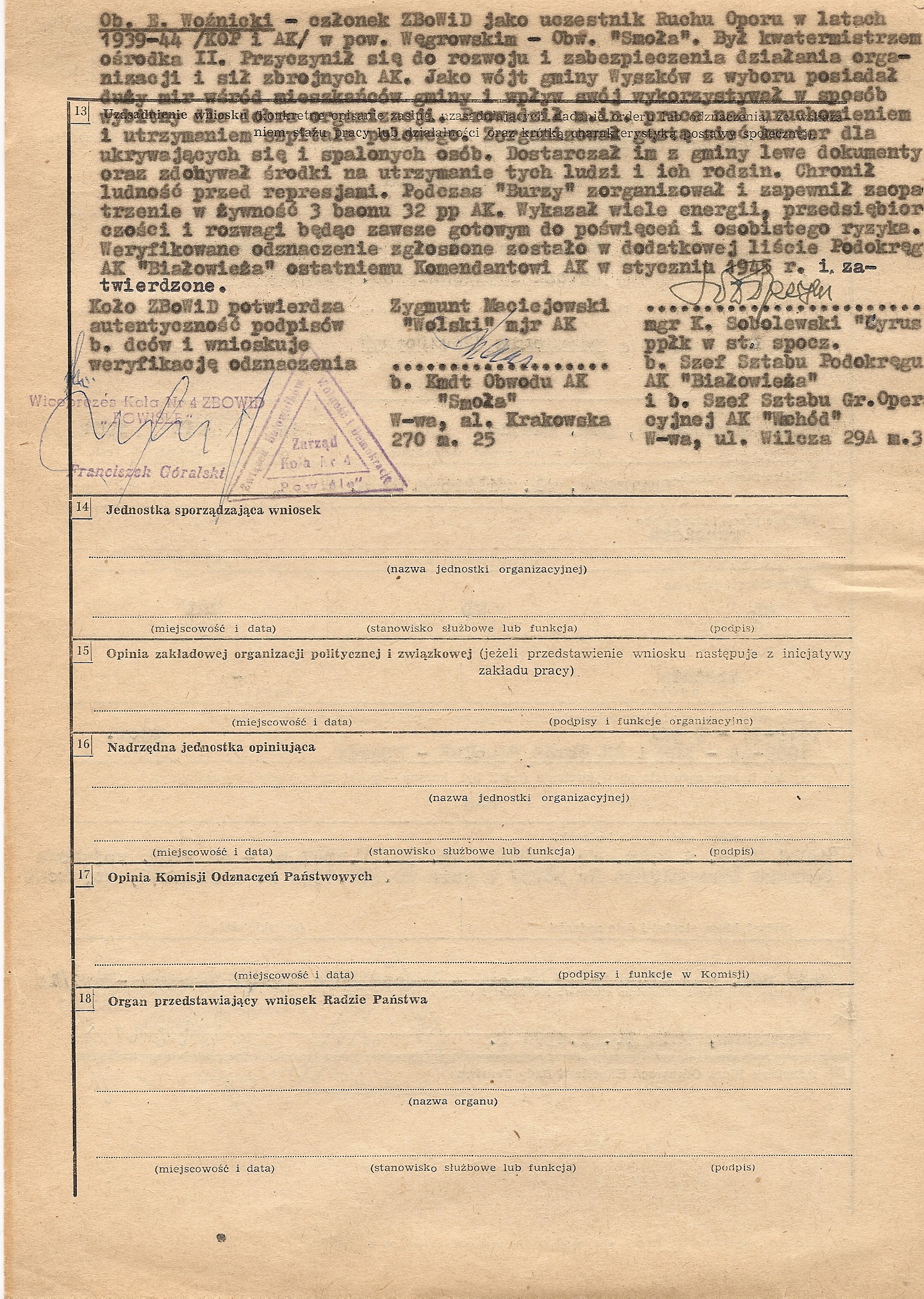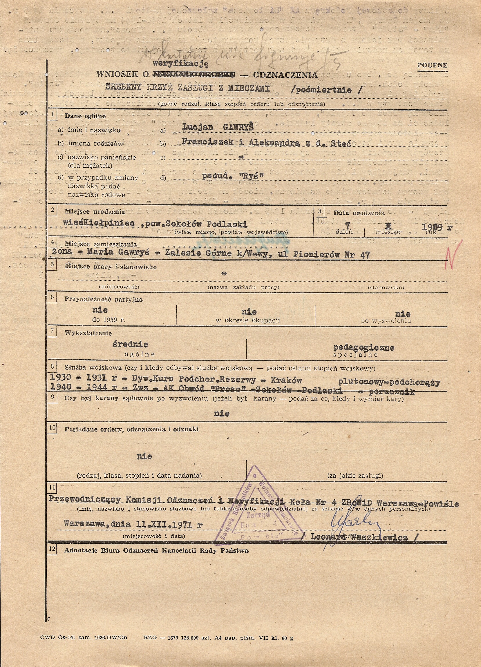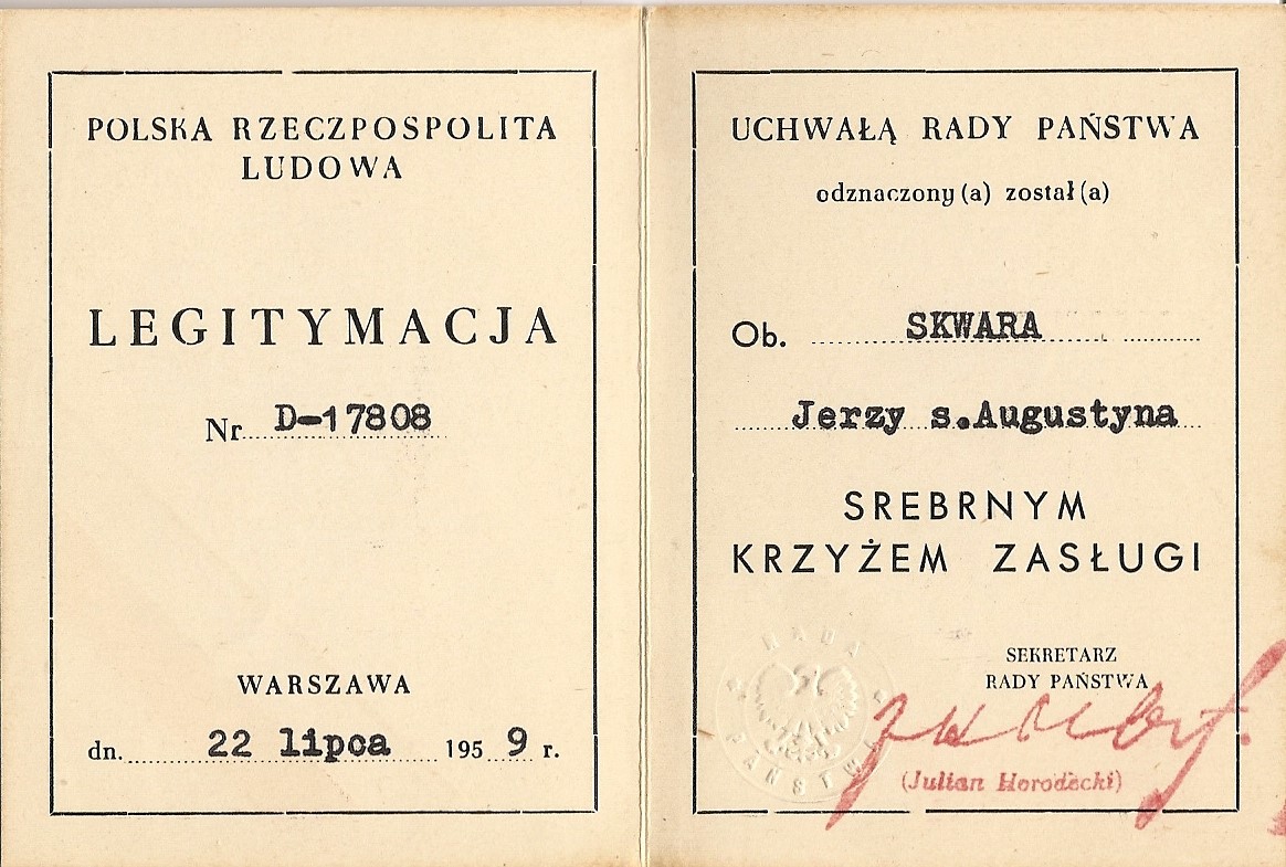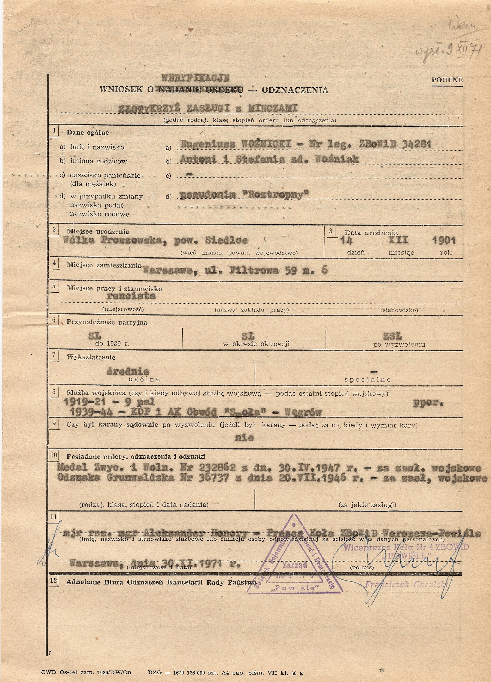 Kilka przykładów wniosków na Krzyże Zasługi z Mieczami załączyłem jako ilustracje do tego artykułu. Wszystkie dotyczą partyzantów AK. Uważny czytelnik zauważy pewnie dziwne daty na wnioskach. I tu warto poruszyć ciekawą sprawę. Krzyż Zasługi z Mieczami nie został bowiem włączony do systemu odznaczeń powojennej Polski (dopiero 3RP uznała to odznaczenie, ale o tym później), jednak od lat 60. w ramach ZBoWiD działały komisje weryfikacyjne do spraw byłych żołnierzy Armii Krajowej. Kierowali nimi często dawni dowódcy AK (np. „Wolski” w Warszawie czy „Wojan” w dawnym Okręgu Radomsko-Kieleckim). Zadaniem tych komisji była przede wszystkim weryfikacja odznaczeń przyznanych partyzantom, ale z takich czy innych przyczyn nie nadanych. Teoretycznie weryfikowani partyzanci powinni być członkami Związku, ale obecność wniosków o weryfikację odznaczeń nadanych pośmiertnie wydaje się potwierdzać, że tej reguły nie trzymano się ściśle. Najciekawszy jest jednak efekt prac tych komisji. Otóż po weryfikacji odznaczenia, było ono uznawane przez władze PRL, które wydawały do niego legitymację i odznakę. W przypadku Krzyża Zasługi z Mieczami sytuacja była o tyle absurdalna, że władze uznawały prawo weterana do noszenia odznaczenia, którego nie uznawały. Nie jestem pewien, czy Krzyże traktowane były w tym momencie oficjalnie jako odznaczenie zagraniczne czy organizacyjne, ale faktem pozostaje, że weterani nosili je zgodnie z „Londyńskimi” zasadami kolejności. Oczywiście władze PRL wydawały, z braku prawidłowych odznak, odznaki zwykłego Krzyża Zasługi w odpowiedniej klasie, większość weteranów przerabiała je jednak lub nabywała kompletne repliki w pracowniach grawerskich.