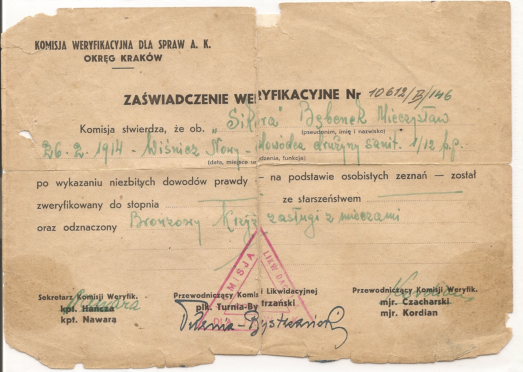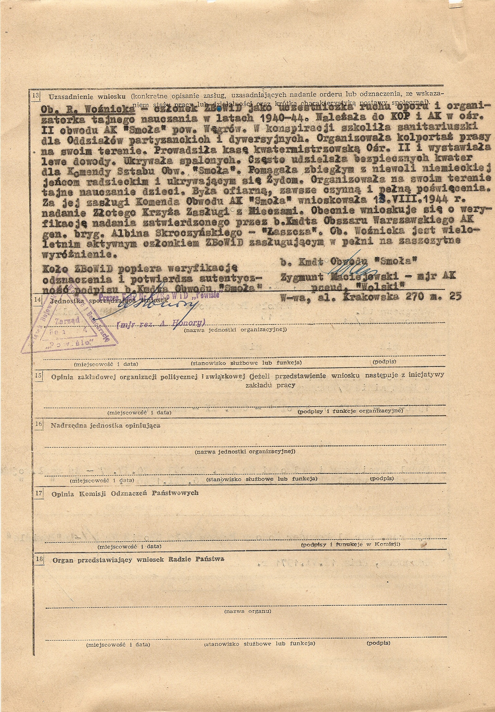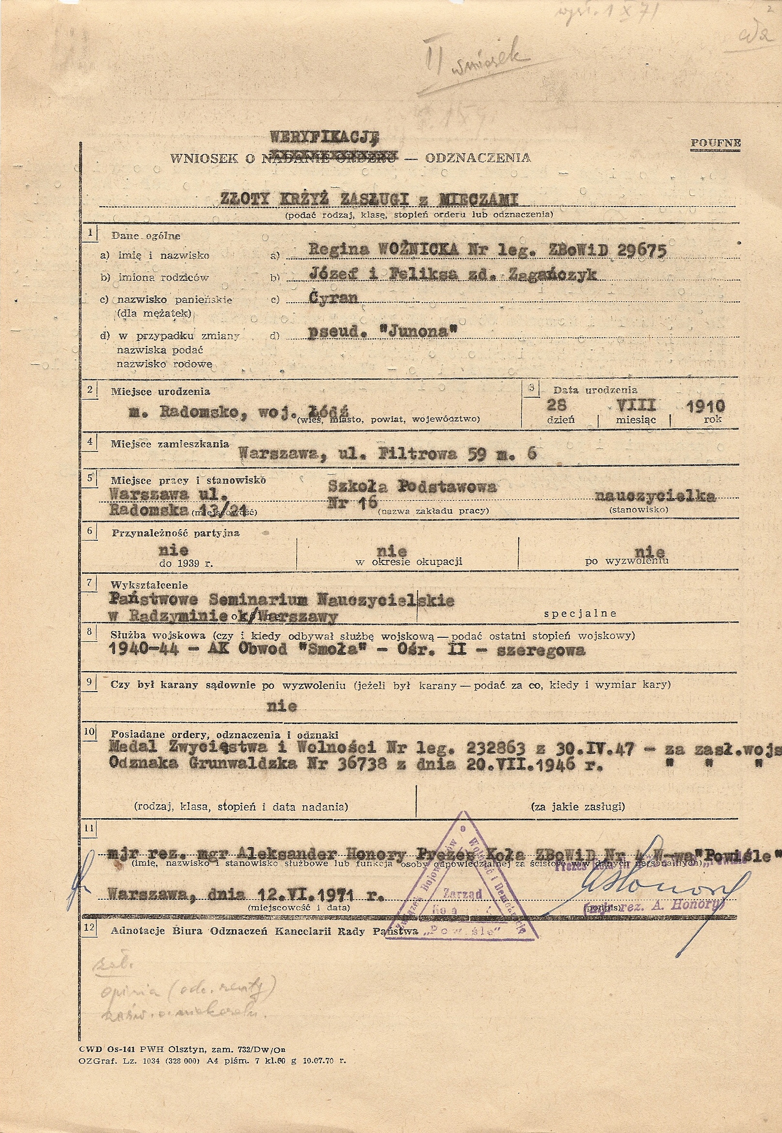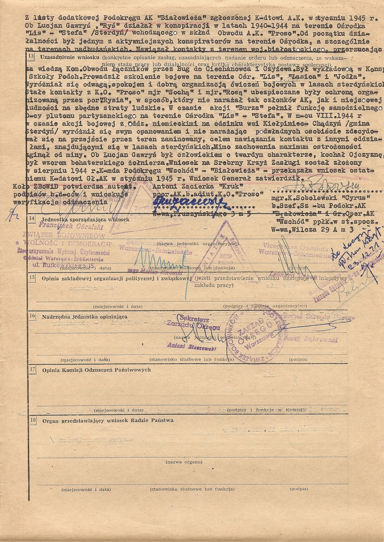 Kilka przykładów wniosków na Krzyże Zasługi z Mieczami załączyłem jako ilustracje do tego artykułu. Wszystkie dotyczą partyzantów AK. Uważny czytelnik zauważy pewnie dziwne daty na wnioskach. I tu warto poruszyć ciekawą sprawę. Krzyż Zasługi z Mieczami nie został bowiem włączony do systemu odznaczeń powojennej Polski (dopiero 3RP uznała to odznaczenie, ale o tym później), jednak od lat 60. w ramach ZBoWiD działały komisje weryfikacyjne do spraw byłych żołnierzy Armii Krajowej. Kierowali nimi często dawni dowódcy AK (np. „Wolski” w Warszawie czy „Wojan” w dawnym Okręgu Radomsko-Kieleckim). Zadaniem tych komisji była przede wszystkim weryfikacja odznaczeń przyznanych partyzantom, ale z takich czy innych przyczyn nie nadanych. Teoretycznie weryfikowani partyzanci powinni być członkami Związku, ale obecność wniosków o weryfikację odznaczeń nadanych pośmiertnie wydaje się potwierdzać, że tej reguły nie trzymano się ściśle. Najciekawszy jest jednak efekt prac tych komisji. Otóż po weryfikacji odznaczenia, było ono uznawane przez władze PRL, które wydawały do niego legitymację i odznakę. W przypadku Krzyża Zasługi z Mieczami sytuacja była o tyle absurdalna, że władze uznawały prawo weterana do noszenia odznaczenia, którego nie uznawały. Nie jestem pewien, czy Krzyże traktowane były w tym momencie oficjalnie jako odznaczenie zagraniczne czy organizacyjne, ale faktem pozostaje, że weterani nosili je zgodnie z „Londyńskimi” zasadami kolejności. Oczywiście władze PRL wydawały, z braku prawidłowych odznak, odznaki zwykłego Krzyża Zasługi w odpowiedniej klasie, większość weteranów przerabiała je jednak lub nabywała kompletne repliki w pracowniach grawerskich.