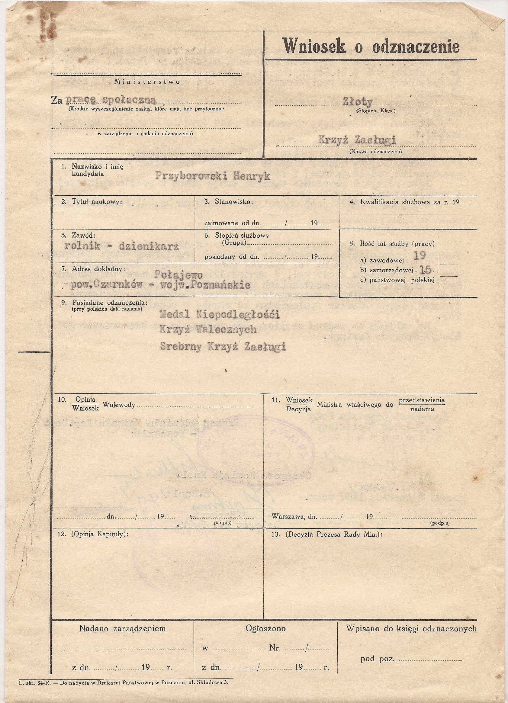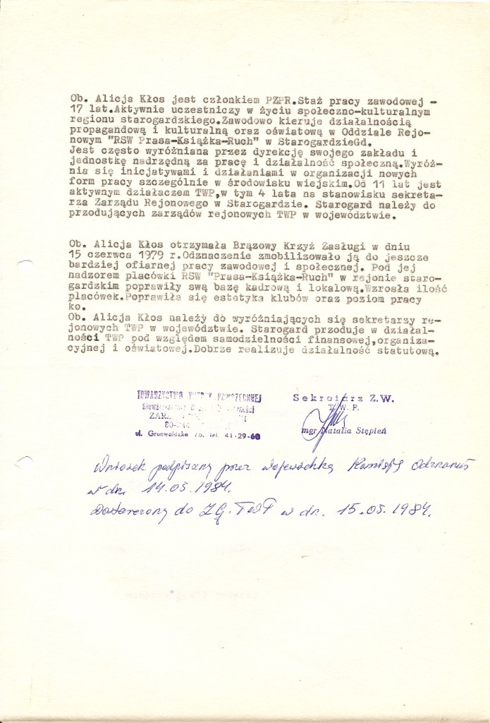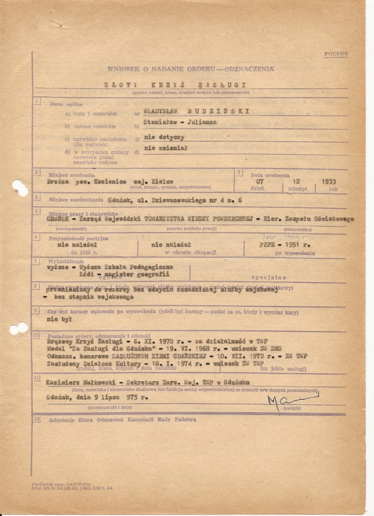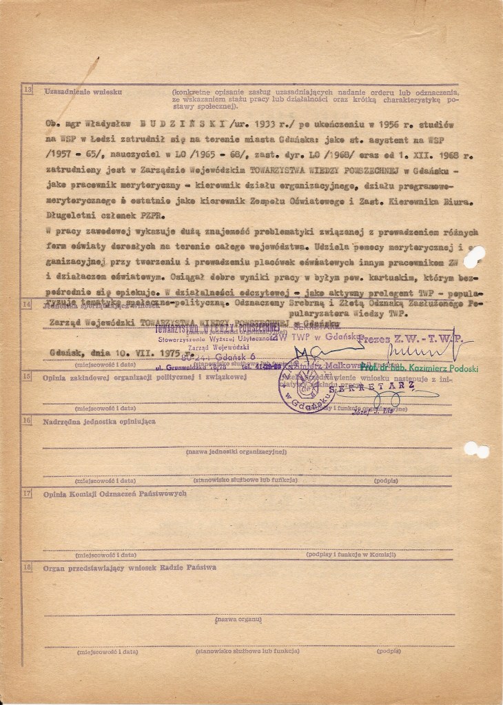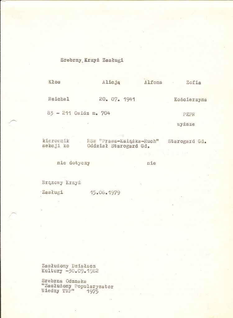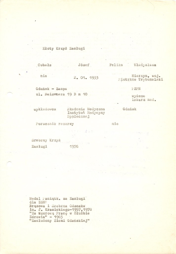 W dalszym ciągu jednak nadawano je za osiągnięcia Sportowcom, pracownikom naukowym czy wojskowym. Najprostszym jednak, prócz pracy w kluczowych gałęziach gospodarki, sposobem na uzyskanie Krzyża Zasługi było wieloletnie i aktywne członkostwo w organizacjach społecznych – oprócz bardziej oczywistych, jak partie polityczne, również w tych mniej znanych – LOK, ZBoWiD, PCK czy nawet ZHP. W załączeniu zobaczyć można przykłady wniosków tego typu – dla aktywnych działaczy Towarzystwa Wiedzy Powszechnej. Tak jak przed wojną, tak i w przypadku wielu powojennych cywilnych wniosków odznaczeniowych „za całokształt” trudno stwierdzić za co konkretnie nadano odznaczenie.