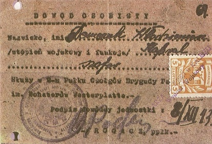 Prawdopodobnie pierwszym polskim dokumentem jaki wydawano żołnierzom formowanych jednostek polskich był wojskowy dowód osobisty. Mimo szumnej nazwy, faksymile takiego dowodu (wydanego 8.08.1943r), które możemy znaleźć we wspomnianym na wstępie zbiorze dokumentów, wskazuje że był to dokument niepozorny i raczej tymczasowy. Ma on postać kawałka zwykłej kartki (prawdopodobnie oryginalny papier był zwykłym papierem do maszyny) o wymiarach 13,5cm x 9cm, na którym za pomocą maszyny do pisania umieszczono tytuł dokumentu („DOWÓD OSOBISTY”), oraz rubryki: „Nazwisko, imię”, „Stopień wojskowy i funkcja” oraz informację stwierdzającą, że w/w rzeczywiście służy w wymienionej jednostce. Widoczna na dolnym skraju linia przerywana sugeruje, że na maszynie do pisania wykonano na kartce a4 kilka takich blankietów, które następnie wycinano. Dokument potwierdzony jest pieczęcią jednostki i podpisem dowódcy. Prawdopodobnie nie jest to jedyny wzór dokumentu tego typu – przepisy mogły określać jakie rubryki powinny się znaleźć w takim dokumencie, ale nie wydaje się by istniał jakiś wzór blankietu, który i tak wykonywano „chałupniczo” na miejscu.