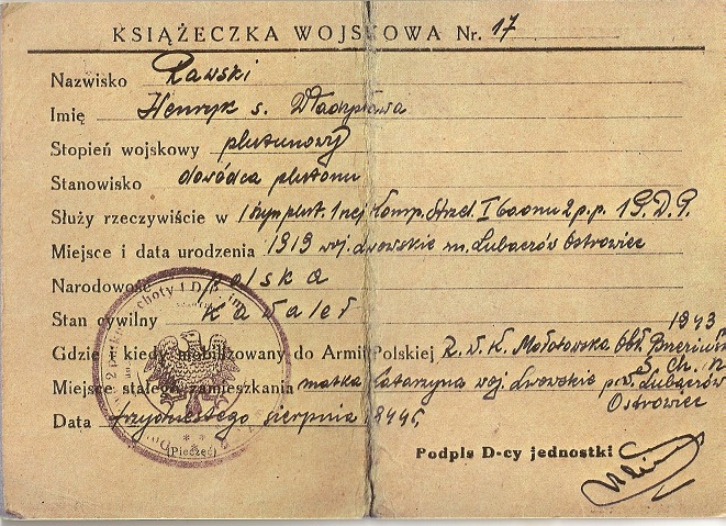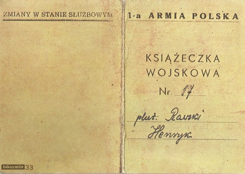 Drugim z interesujących nas dokumentów jest wcześniejsza wersja książeczki wojskowej. Co ciekawe, nie jest ona ani wzorowana na radzieckiej, ani dwujęzyczna, w dodatku posiada tylko 4 strony (licząc tytułową) i dość niestandardowy rozmiar: złożona ma 15cm x 10,5cm.* Pierwsza strona książeczki zawiera nagłówek „1-a ARMIA POLSKA”, poniżej zaś tytuł „KSIĄŻECZKA WOJSKOWA”, numer książeczki oraz rubryki na nazwisko i imię właściciela.