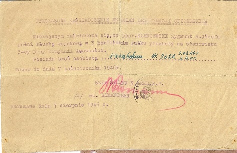 Inną ciekawą kwestią, na której temat sporo słyszałem jest stosowanie w 1 i 2 Armii Wojska Polskiego dokumentów zastępczych. Oczywiście w warunkach frontowych często musiało brakować właściwych blankietów. Z posiadanych informacji wiem, że braki takie były dość częste, choć starano się je uzupełniać możliwie szybko, a wówczas dokument zastępczy był zwykle niszczony lub przekazywany do archiwum. Pamiętać też należy, że dokumenty zastępcze – często wykonane na marnym papierze i noszone przez żołnierzy cały czas przy sobie, często składane i rozkładane, narażone na działanie wilgoci – szybko się zużywały. W związku z tym niewiele ich dotwało do naszych czasów, a jeszcze mniej trafiło na szeroko pojęty rynek kolekcjonerski. W tym miejscu chciałbym zaprezentować przykład takiego dokumentu tymczasowego wydanego dla oficera 3pp zamiast legitymacji oficerskiej (być może w zastępstwie dokumentu zaprezentowanego w pierwszym artykule. Dokument ten pochodzi już z sierpnia 1946r., jednak można sądzić, że podobnie wyglądały dokumenty tymczasowe w czasie wojny. Pamiętać jednak należy, że nie istniał żaden jednolity wzór takich dokumentów tymczasowych i wszelkie ich przykłady traktować należy jako ciekawostkę, a nie jako jedyną obowiązującą wersję.