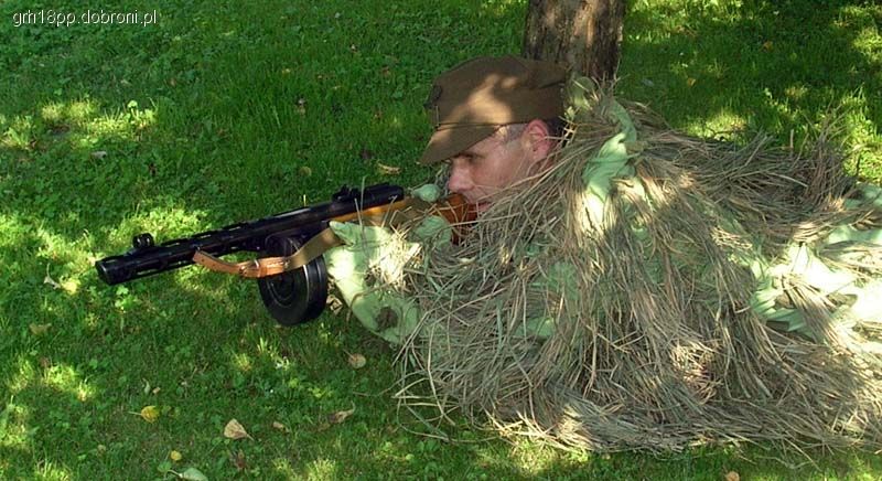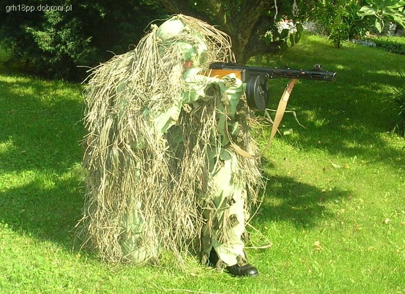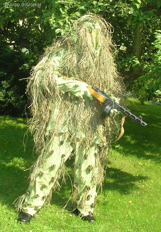 Przez długi czas zbierałem informacje, przy czym nieocenione okazały się źródła rosyjskojęzyczne, przede wszystkim rosyjskie fora rekonstrukcyjne i historyczne. Okazało się, że ubranie to występuje pod rosyjską nazwą ‘маскировочный костюм мочального типа’ lub ‘мочальный масккостюм'(мочал – ros. łyko). Spotyka się także potoczne określenie ‘кикимора’ (przy czym ‘kikimora’ w rosyjskim to także współczesne stroje typu ghillie suit) W końcu udało mi się ustalić, że krój stroju jest identyczny jak białego kombinezonu zimowego. Trochę popchnęło mnie to do przodu – wystarczy taki biały strój odpowiednio zafarbować. Niby proste, ale Rosjanie określają kolor swoim ulubionym słowem-wytrychem: ‘zaszczitnyj’ (ochronny). Niestety, zaszczitnyj to może być w zasadzie wszystko od soczystej trawiastej zieleni po prawie khaki. Zdjęcia historyczne znalazłem tylko czarno-białe, współczesne rosyjskie rekonstrukcyjne kopie mają kolory od Sasa do lasa (przy czym na forach historycznych wszyscy zarzucają sobie niewłaściwy odcień. Dominuje jednak jasna, wyblakła zieleń trawiasta, dlatego zdecydowałem się działać. Strój został pofarbowany zwykłym barwnikiem do tkanin (ok. 2 zł, trzeba godzinę gotować), zmieszane kolory pistacjowy i oliwkowy w proporcji 2-1. Kolor wyszedł niestety zbyt jaskrawy, dlatego konieczne było dwukrotne wypranie z wybielaczem w temperaturze 90 stopni i powieszenie na kilka tygodni na trzepaku. Następnie naszyłem podwójne pętelki z pociętego na paski prześcieradła wojskowego (zużyłem trzy prześcieradła, nieco różniące się odcieniem), w odstępach co 10 cm, przy czym rzędy były przesunięte w poziomie o 5 cm. Do pętelek przyczepiłem pęczki łyka (kupione na portalu aukcyjnym w cenie 17 zł za kilogramowy warkocz). Wcześniej łyko zafarbowałem, nie rozwijając warkocza, co dało efekt nierównomiernego nasączenia barwnikiem (farby takie same jak użyte do farbowania stroju, lecz tym razem kolor zielony z brązowym, proporcja 2-1). Zgodnie z instrukcją żołnierz samodzielnie doczepiał łyko zależnie od potrzeb i kolorystyki terenu. Do tego podwójne pętelki umożliwiają mocowanie także świeżej roślinności. Z uwagi na to, że oryginalne zdjęcia pokazują sylwetki z niewielką ilością łyka (najprawdopodobniej zrywało się ono podczas działania), starałem się nie przesadzać z wiązaniem materiału maskującego. Więcej poszło na ramiona i głowę, mniej na spodnie. Tak powstał strój, który zapewne stanie się ciekawym uzupełnieniem sylwetki strzelca wyborowego naszej grupy.