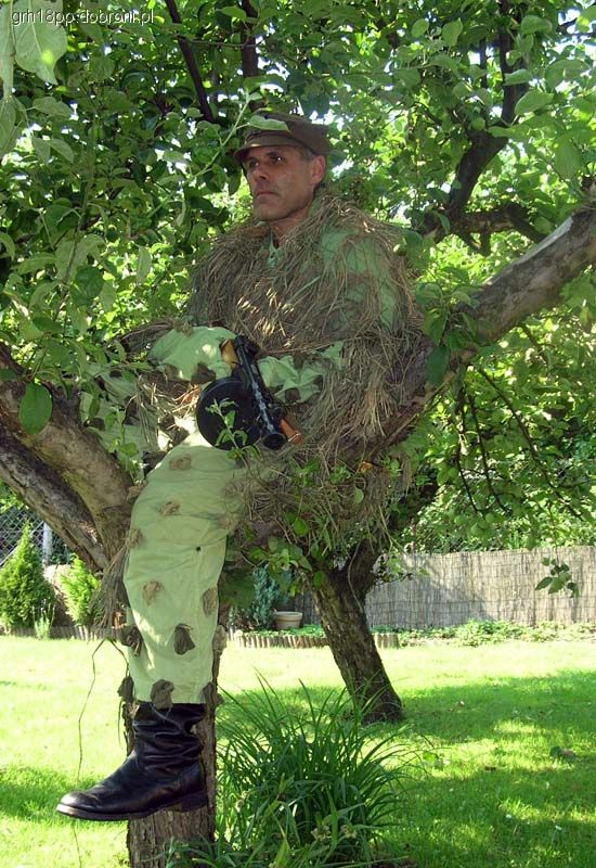 To samo z kapturem i rękawicami. Postawa klęcząc – widać, jak ładnie rozmywa się sylwetka strzelca… Na drzewku, wśród liści (jabłonka w moim ogrodzie). Buty chromowe radzieckie.