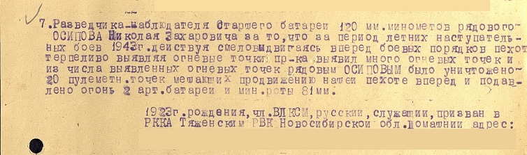 „W czasie letnich (…) walk 1943r. działając śmiało wypuszczał się przed szeregi piechoty cierpliwie ujawniając punkty ogniowe przeciwnika<.>Wyjawił wiele punktów ogniowych i spośród liczby punktów ogniowych wyjawionych przez szeregowego Osipowa unieszkodliwiono 20 stanowisk karabinów maszynowych przeszkadzających naszej piechocie ruszyć naprzód i podawano współrzędne celu 2 baterii artylerii i kompanii moździerzy 81mm.”