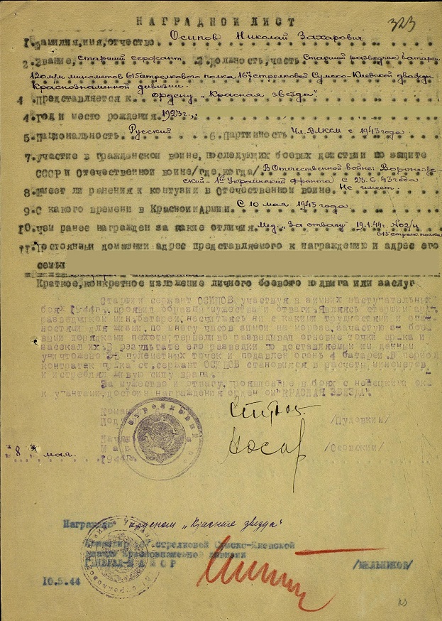 Prawdopodobnie przy okazji odznaczenia, bądź też za inne zasługi, otrzymał też awans, gdyż we wniosku odznaczeniowym z 8 maja 1944r. jest już wymieniony jako starszy sierżant. Wówczas to właśnie dowódca 615 pułku strzeleckiego podpułkownik Pudowkin wraz z naczelnikiem sztabu majorem Osowskim podpisali wniosek o odznaczenie „Starszego zwiadowcy” Osipowa Orderem Czerwonej Gwiazdy. W uzasadnieniu tego wniosku możemy przeczytać: