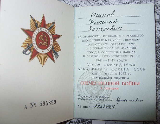 „Starszy Sierżant Osipow, biorąc udział w <…> walkach 1944r. ukazał wzór męstwa i odwagi. Będąc starszym zwiadowcą artylerii przy baterii moździerzy nie licząc się z żadnymi trudnościami i niebezpieczeństwami dla życia, przez wiele godzin zimą i na mrozie <…> cierpliwie rozpoznawał punkty ogniowe przeciwnika i oaznaczał je. W rezultacie jego zwiadu według dostarczonych im przez osipowa danych unieszkodliwiono 35 punktów ogniowych i skierowano ogień 4 baterii. W czasie kontrataków przeciwnika starszy sierżant Osipow przystąpił do załogi moździerza i przetrzebiał <…> siły wroga.Za męstwo i odwagę przejawione w walkach z niemieckimi okupantami zasługuje na odznaczenie orderem Czerwonej Gwiazdy.”