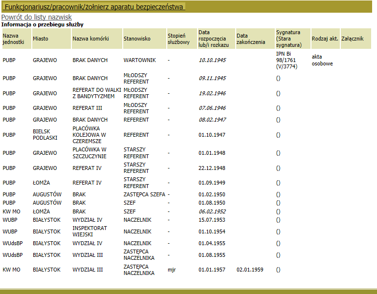 Przykład pierwszy – w moje ręce swego czasu trafił dosyć spory zbiór zdjęć – legitymacyjnych i codziennych, w mundurze i w cywilu – należący do pewnego oficera. Na podstawie samych zdjęć niewiele dało się powiedzieć. Widać było, ze był wojskowym (korpusów ki wskazywały na piechotę), że pełnił jakieś funkcje oficjalne (było kilka zdjęć z różnych uroczystości) i prowadził całkiem zwyczajne życie rodzinne. Ciekawostką było pewne zdjęcie legitymacyjne – wyraźnie bowiem widać było na nim owego człowieka w mundurze wz.52 – z korpusówkami piechoty i oznaczeniem stopnia kapitana – noszącego cztery odznaczenia – Krzyż Walecznych, medal „Zasłużonym na Polu Chwały”, medal X-lecia PRL oraz odznakę „W służbie Narodu”. Zestaw interesujący, ale nie pozwalający na identyfikację. Na szczęście na odwrocie zdjęcie było podpisane – Feliks Czaplejewicz, s. Aleksandra. Nazwisko to w jakiś sposób brzmiało znajomo – do dziś nie wiem czy słusznie, ale możliwe, że trafiłem na nie w czasie studiów, czytając materiały do zajęć z historii najnowszej. Odznaka „W służbie narodu” była dobrym drogowskazem, a zatem w wyszukiwarce u góry strony wpisałem nazwisko i zaznaczyłem opcję „we wszystkich katalogach”. W efekcie pojawiły się dwa nazwiska: Czaplejewicz Józef* i Czaplejewicz Feliks. Po wybraniu właściwej osoby ukazały się podstawowe dane, takie jak imię, nazwisko, data i miejsce urodzenia oraz imiona rodziców – już coś. Poniżej zaś znalazła się informacja, której się spodziewałem: Funkcjonariusz/pracownik/żołnierz aparatu bezpieczeństwa. Po kliknięciu na ową nazwę kategorii, rozwinął się uproszczony zapis przebiegu służby z lat 1945-1959 (więc pewnie do emerytury). Tym samym nie dowiedziałem się za co kapitan Czaplejewicz otrzymał Krzyż Walecznych (biorąc pod uwagę fakt, że urodził się w 1925r. mógł go otrzymać jeszcze w czasie wojny), ale przynajmniej uzyskałem podstawowe informacje na jego temat oraz wgląd w powojenną, dość imponującą karierę – od wartownika w PUBP w Grajewie do zastępcy naczelnika Wydziału III w KW MO w Białymstoku. W niektórych wypadkach jednak taki przebieg służby pozwala na powiązanie konkretnego, powojennego odznaczenia z konkretnym okresem służby, co w niektórych przypadkach można uznać za częściowe uzasadnienie odznaczenia. Pokażę to może na drugim przykładzie.