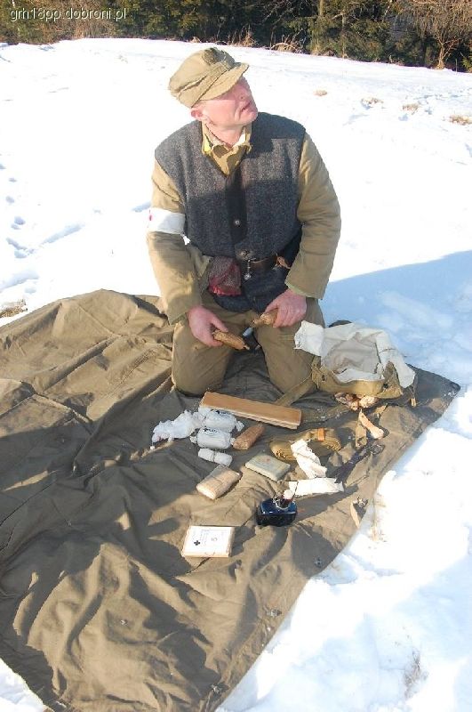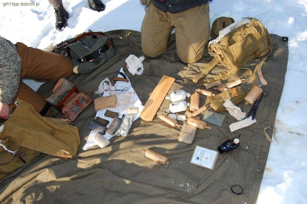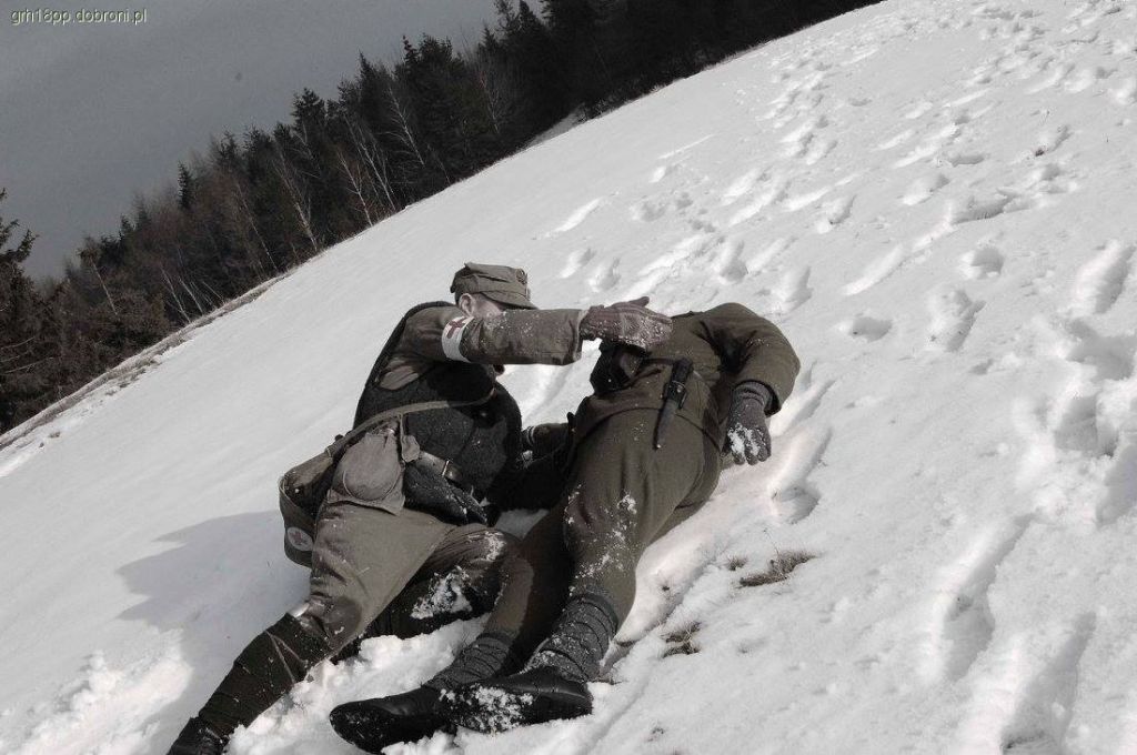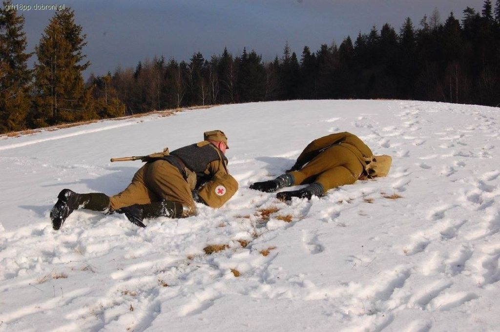 W dniu 27 stycznia, w przepięknej scenerii masywu Mogielnicy, odbyły się manewry 1PSP AK pod kryptonimem “Krew na śniegu” z gościnnym udziałem sanitariusza “Osiemnastego Kołobrzeskiego” – Pitera. W ich trakcie zapoznano się z zarysem historycznym końcowego okresu wojny, a zwłaszcza Bitwy Szczawskiej, omówiono zachowane dokumenty m.in. na temat organizacji i składu służby medycznej AK z tego okresu, a następnie przystąpiono do ćwiczeń praktycznych. Podczas tychże porównano skład zasobnika medycznego sanitariusza AK i sanitariusza 1 AWP na froncie wschodnim.