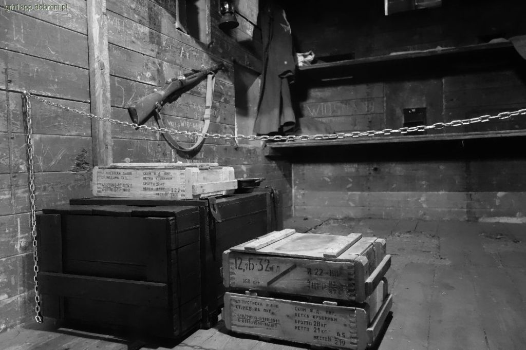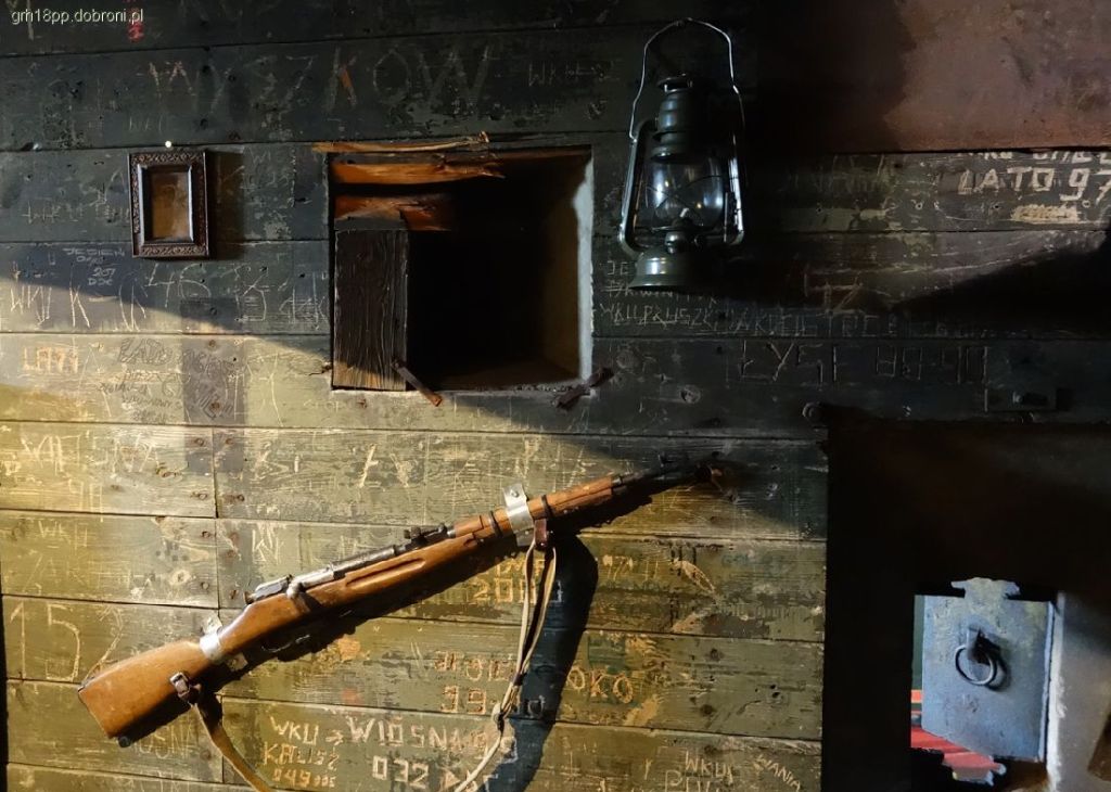 W toku tworzenia ekspozycji naprawiono (z odpowiedniego drewna rozbiórkowego) dwie prycze oraz klapę włazu desantowego. Do prycz uszyliśmy sienniki, które wkrótce zostały elegancko i wygodnie wypchane słomą. Na ścianach zawieszone zostały tablice informacyjne (łatwo demontowane w razie potrzeby wystawienia dioramy), a także – przygotowane przez piszącego te słowa – transparenty, których zadaniem jest w głównej mierze zakrycie najbardziej rzucających się w oczy napisów wyrytych przez kolejne roczniki poborowych. Zawiesiliśmy również zabytkowy obrazek święty oraz odpowiednią lampę naftową. Do ściany przyśrubowano solidnie atrapę karabinu, na podłodze rozstawiliśmy skrzynie amunicyjne, które (po wymianie wiek na płyty pleksi) służą jako gabloty.