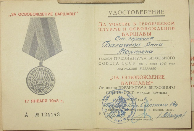 Anna Markowna Bałaszowa urodziła się w 1922r. w miejscowości Artiomowo w Rajonie Aleksandrowskim w Obłasti Iwanowskiej (nie zdołałem ustalić dokładnie o którą miejscowość chodzi – być może o Artiomowo w Rajonie Szujskim), w rosyjskiej rodzinie. Można powiedzieć, że trafiła idealnie – Wojna Domowa się skończyła, a rosyjska wieś zwykle dość łagodnie przeżywała czasy stalinowskie. Anna odebrała, jak na tamte czasy, dość solidne, średnie wykształcenie, w czym nie przeszkodził nawet wybuch wojny radziecko-niemieckiej. W maju 1942r. zostaje zmobilizowana (prawdopodobnie jako ochotnik) do Armii Czerwonej.