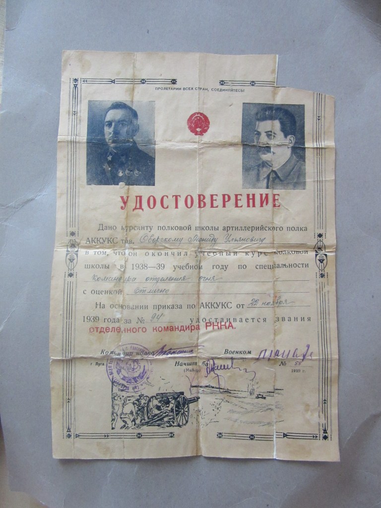 W 1937r. ukończył Technikum Hydromelioracyjne (niestety, nazwy miasta nie udało mi się rozszyfrować), co w owym czasie oznaczało całkiem solidne wykształcenie techniczne. Prawdopodobnie na początku 1938r. został powołany do wojska i w październiku został słuchaczem Szkoły Pułkowej przy pułku artylerii w mieście Ługa, następnie przekształconej w pułkową szkołę AKKUKS (Artyleryjskie Orderu Czerwonego Sztandaru Kursy Doskonalenia Kadry Dowódczej), którą ukończył w listopadzie roku następnego. Według zachowanego dyplomu, ukończył kurs dowódców oddziałów ogniowych z oceną wzorową i otrzymał „stopień” dowódcy drużyny RKKA*.