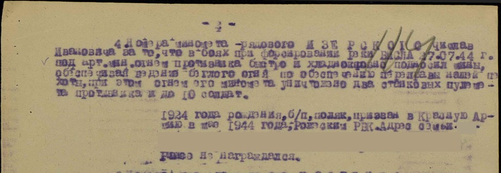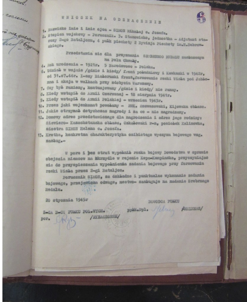 jednostki na Smoleńszczyźnie w lutym 1944r. Jego udział w tych walkach doceniło