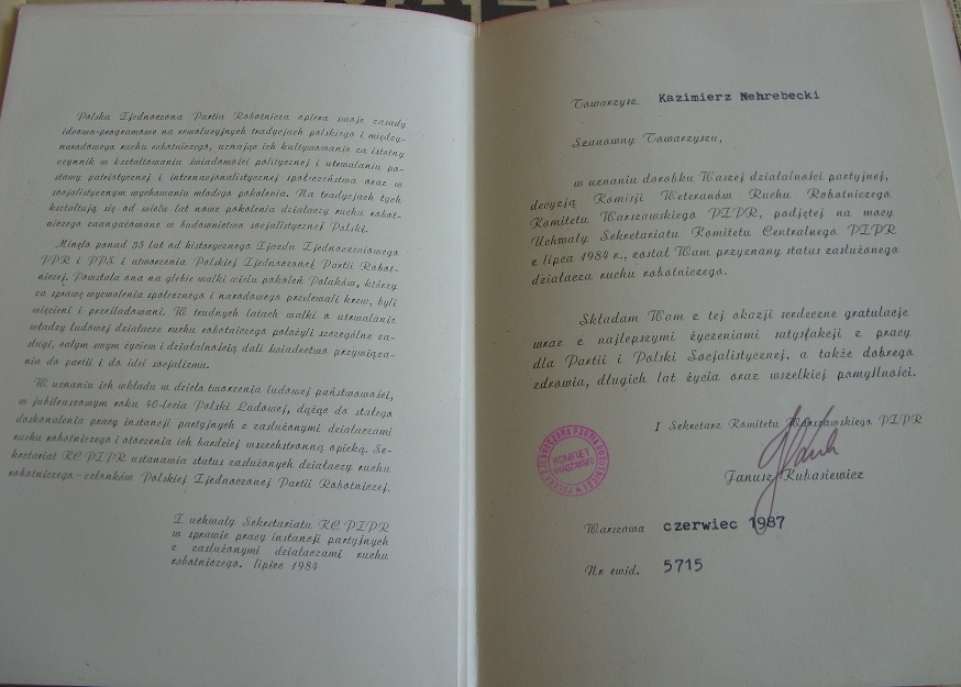ppłk. Kazimierz Nehrebecki wyróżniony został przez partię tytułem Zasłużonego