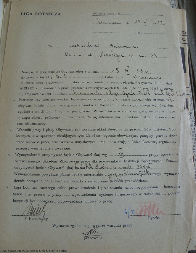 W 1953r. pracuje w Lidze Lotniczej na stanowisku Kierownika