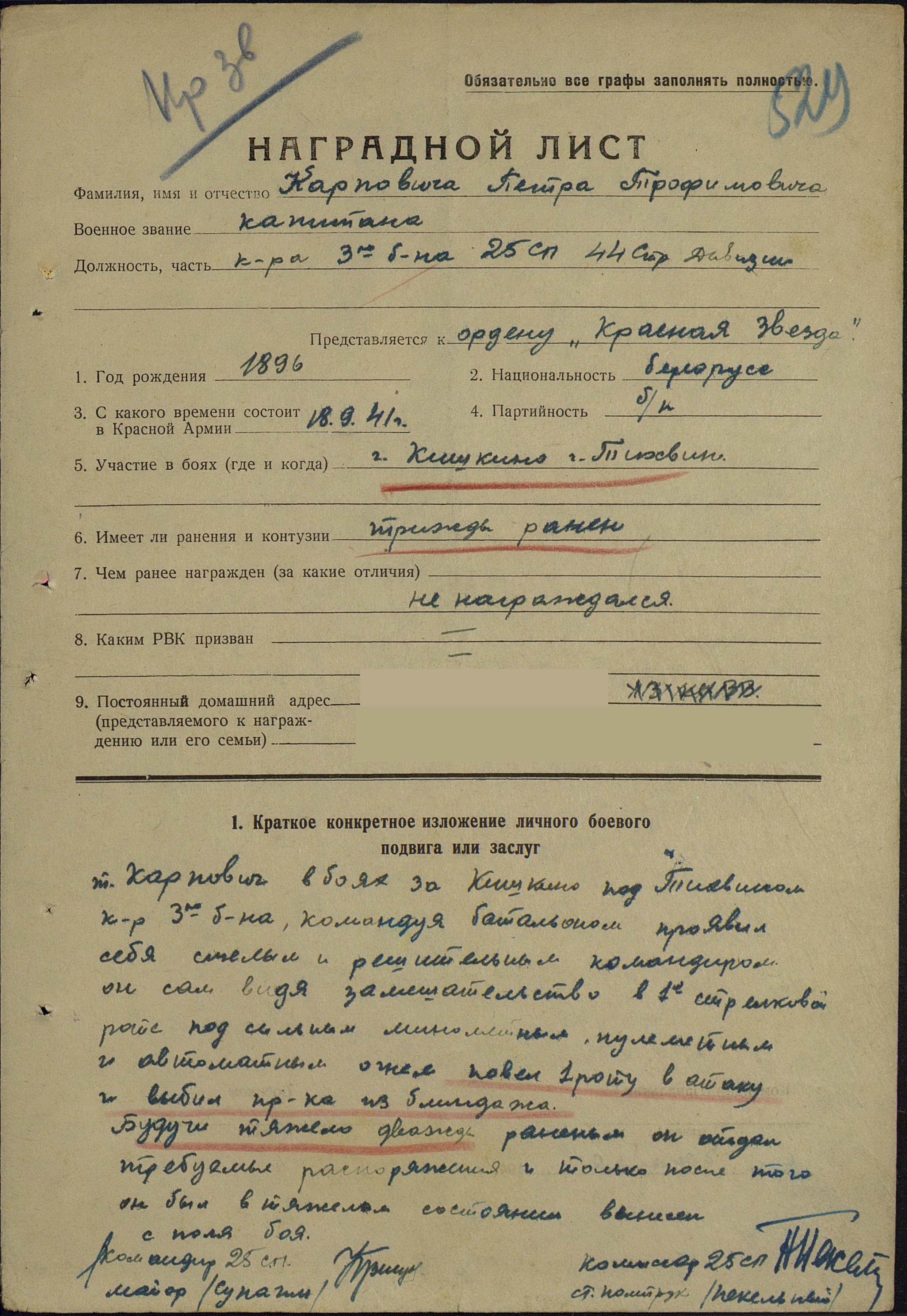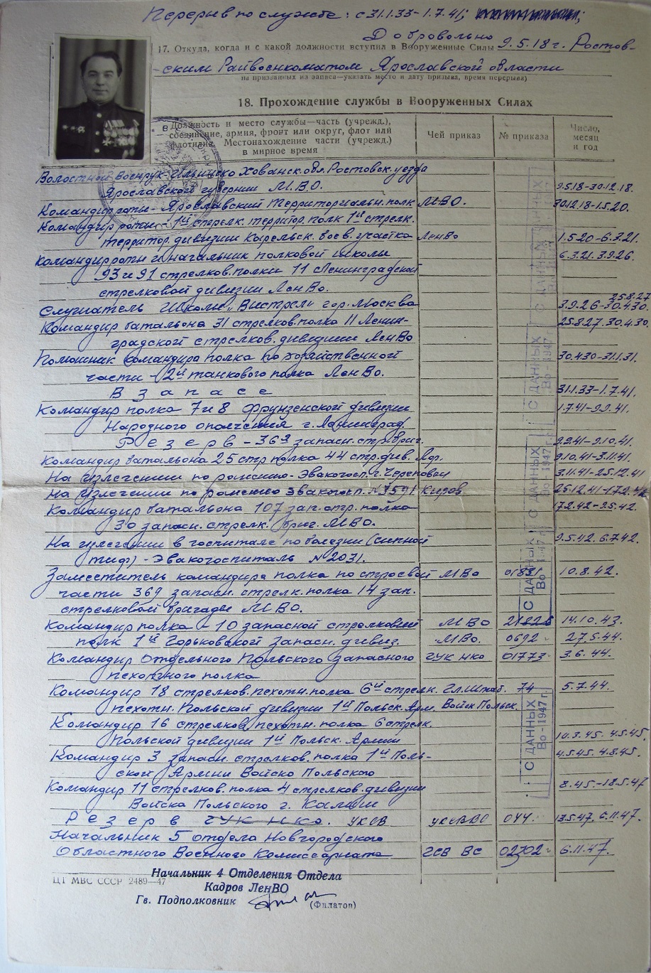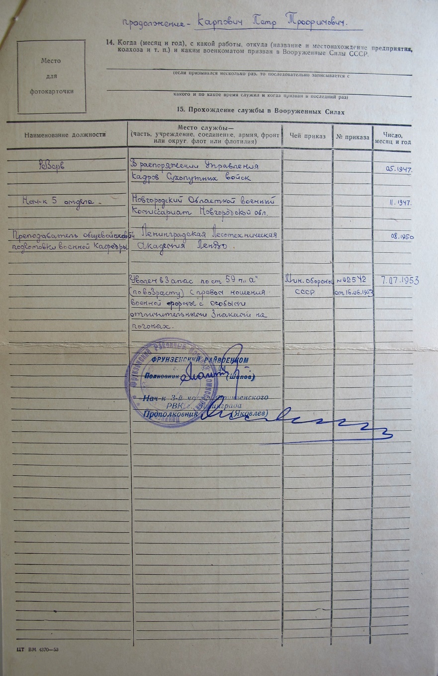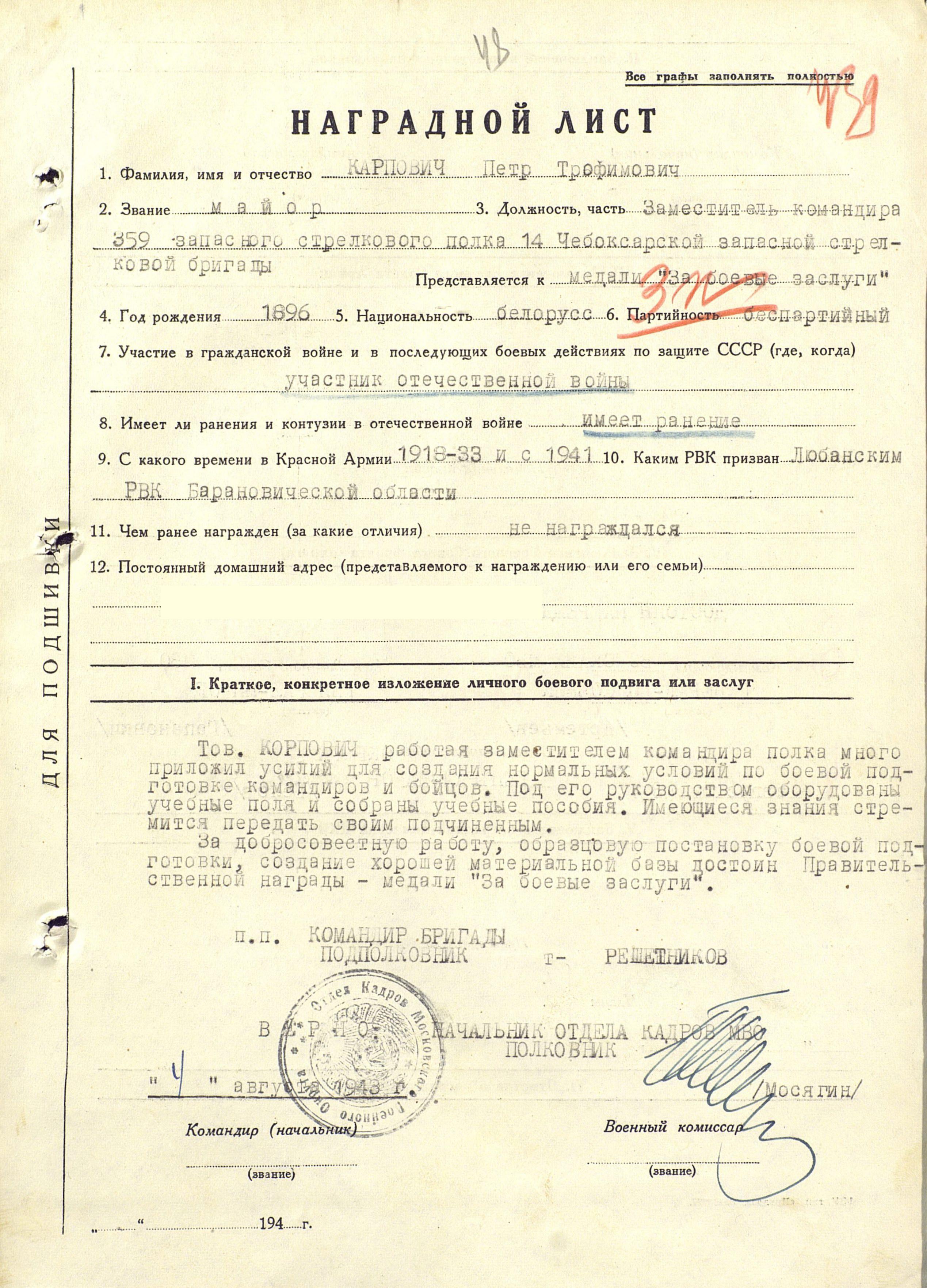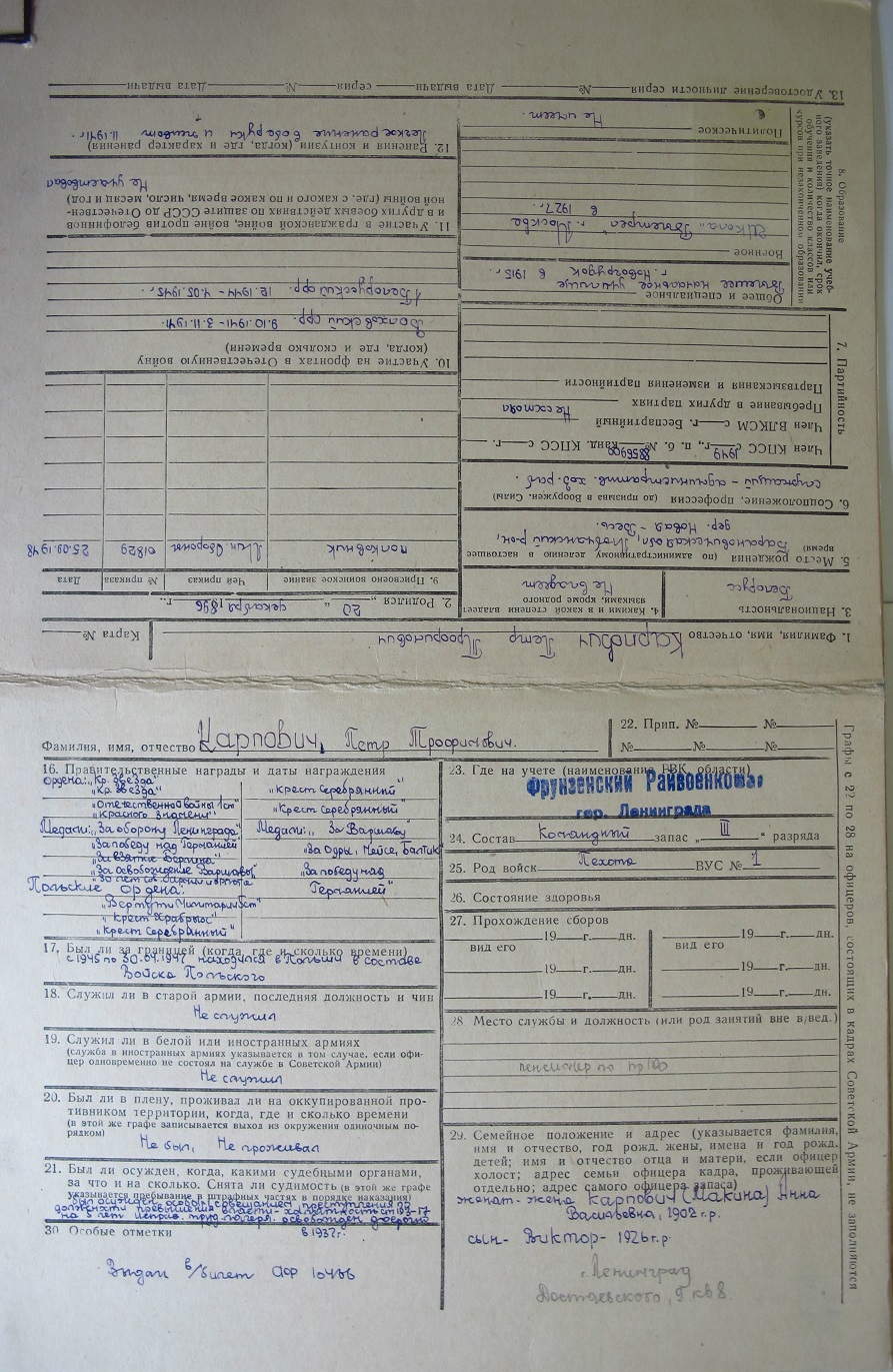Niestety, pomimo podjętych starań, nie udało mi się uzyskać dostępu do teczki akt osobowych oficera. W związku z tym jedyne dokumenty, na których mogłem się oprzeć to trzy dostępne wnioski odznaczeniowe i dwa arkusze ewidencyjne oficera. Te ostanie oferują nam szereg podstawowych informacji o samym oficerze i skrócony przebieg jego służby, tworząc niejako „szkielet” historii, zaś dzięki wnioskom odznaczeniowym możemy bliżej przyjrzeć się określonym wycinkom jego wojennej drogi, co pozwala tchnąć w ów szkielet nieco życia. Pierwszy arkusz ewidencyjny został sporządzony w 1947r., po powrocie Karpowicza do ZSRR, przez Naczelnika 4 Oddziału Kadr Leningradzkiego Okręgu Wojskowego podpułkownika gwardii Fiłatowa i był uzupełniany aż do roku 1953. Drugi sporządzony został po przejściu pułkownika do rezerwy w 1953 roku przez pułkownika Szapowa, Komendanta Frunzewskego RWK w Leningradzie, i od chwili sporządzenia nie był aktualizowany. Jaka historia wyłania się z tych dokumentów?