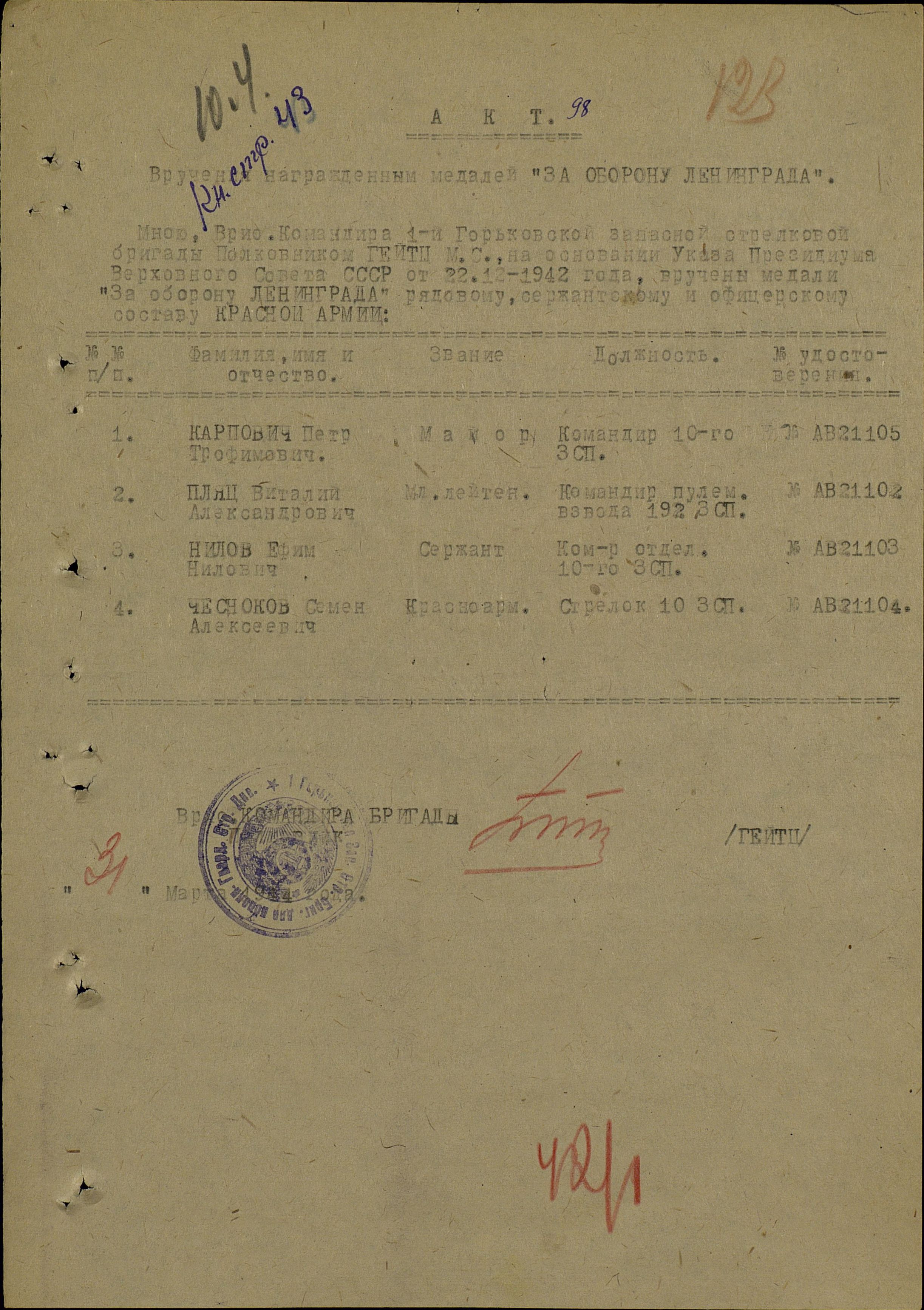 Co ciekawe, wniosek ten w odpowiedniej rubryce podaje, że Karpowicz był ranny trzykrotnie. Albo więc jest to jakaś pomyłka, albo musiał być ranny wcześniej. Wniosek ten przeszdł długą drogę, gdyż ostatecznie dopiero 5 sierpnia 1942 roku wydany został rozkaz, na mocy którego odznaczenie zostało nadane.