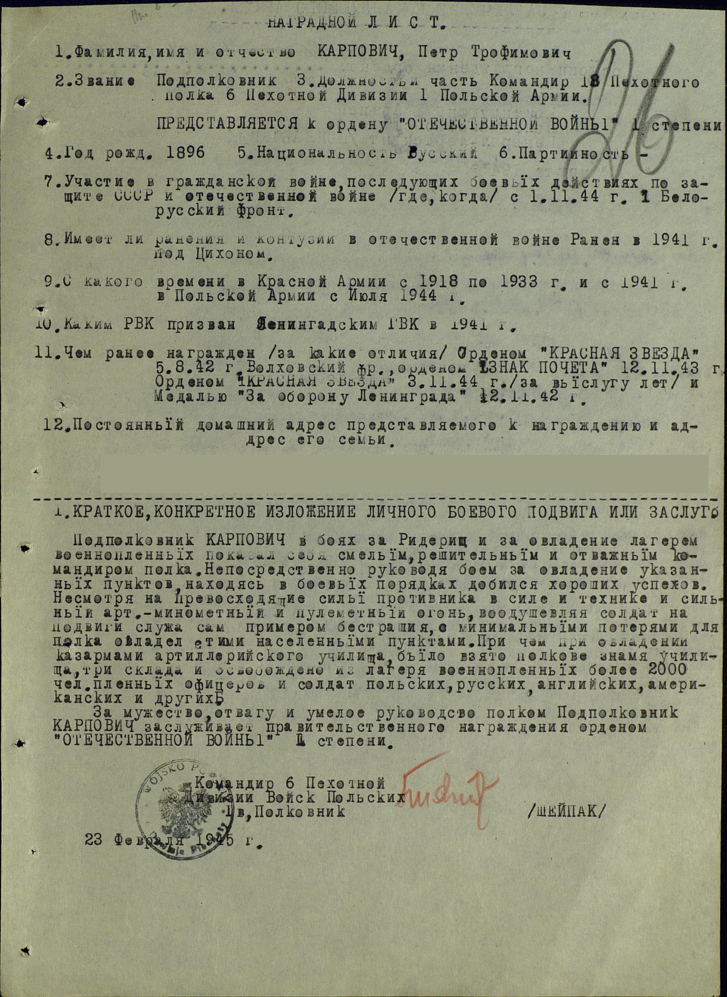4 sierpnia 1943r. zastępca dowódcy wojsk Moskiewskiego Okręgu Wojskowego, generał-lejtnant Sokołow zadecydował o zmianie odznaczenia na Order „Znak Honoru”, będący raczej odznaczeniem cywilnym, ale z całą pewnością wyższym niż medal „Za zasługi bojowe”. Jednak sam Karpowicz musiał na order trochę poczekać, bo aż do 12 listopada 1943r. W tym czasie już od dwóch miesięcy był dowódcą 10 zapasowego pułku strzeleckiego 1 Gorkowskiej Dywizji Zapasowej w Moskiewskim Okręgu Wojskowym. Stanowisko to pełnił do 27 maja 1944r. Warto zwrócić uwagę, że – bądź, co bądź – doświadczony dowódca zajmował wprawdzie dość wysokie stanowiska, ale jednak w jednostkach zapasowych. Choć nie ma na temat przyczyn takiego stanu rzeczy żadnej wzmianki w dostępnych dokumentach, to znając wojenną praktykę radziecką, polegającej na obsadzaniu stanowisk w jednostkach szkolnych i zapasowych oficerami zakwalifikowanymi jako niezdolni do służby liniowej, można domyślać się, że taką kwalifikację otrzymał również Karpowicz – długoletnia służba wojskowa, pobyt w łagrze, rany i choroba nie mogły pozostać bez wpływu na zdrowie oficera. Prawdopodobnie zatem błąkałby się po kolejnych pułkach zapasowych i szkołach wojskowych do końca wojny, gdyby nie chroniczny brak kadry oficerskiej w Wojsku Polskim. Trudno powiedzieć, czy zadecydował fakt pochodzenia z terenów zamieszkanych w znacznej mierze przez ludność polską, czy może chociaż podstawowa znajomość języka polskiego***, czy po prostu nie było specjalnie pomysłu na dalszą karierę czterdziestoośmioletniego majora, ale 3 czerwca 1944r. został Karpowicz dowódcą Samodzielnego Polskiego Zapasowego Pułku Piechoty, by już miesiąc później zostać dowódcą 18 pułku piechoty 6 Dywizji Piechoty 1AWP. Już jako polski oficer otrzymał 1 grudnia 1944r. awans na podpułkownika, a w lutym 1945r., po walkach na Wale Pomorskim, został przez dowódcę dywizji gen. Szejpaka przedstawiony do odznaczenia Orderem Wojny Ojczyźnianej I klasy: