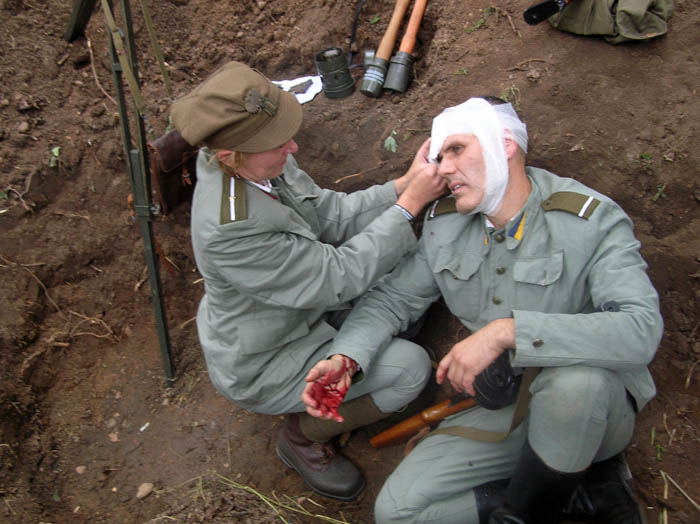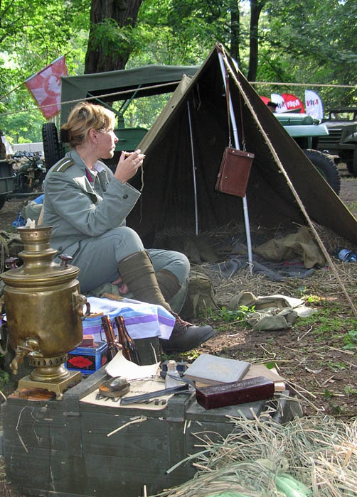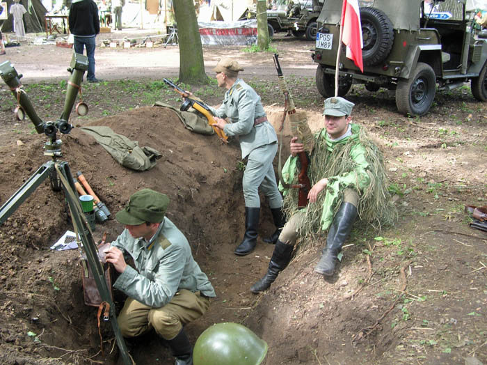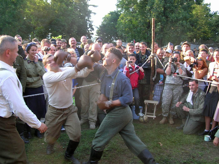 W sobotę wczesnym rankiem przygotowaliśmy naszą dioramę. Rozstawiliśmy wojennej produkcji AST i przygotowaliśmy przy nim stanowisko obserwatora. Do tego urządziliśmy niewielki kącik bytowy, gdzie na stoliku ze skrzynek stał przedwojenny węglowy samowar i różne inne przedmioty. Samowar okazał się zresztą niezwykle przydatnym elementem dioramy, zapewniając nam gorąca herbatę przez cały czas trwania imprezy. Ruch zwiększał się z minuty na minutę, zwiedzających było coraz więcej i prawie wszyscy zatrzymywali się choć na chwilę przy naszym obozie. Spowodowane to było zapewne w głównej mierze korzystnym usytuowaniem, ponieważ trzeba uczciwie przyznać, że większość innych dioram była o wiele bardziej imponująca. Tym niemniej zainteresowanie widzów powodowało konieczność ciągłej „obsługi” zwiedzających. Udało się jedynie wygospodarować krótkie przerwy, kiedy to kolejno zmienialiśmy się, aby odwiedzić dioramy innych uczestników i wysłać listy z niezwykłej poczty polowej. Na obejrzenie inscenizacji już niestety czasu zabrakło. Okazało się także, że nie została przewidziana żadna inscenizacja, w której moglibyśmy wziąć udział – spory potencjał grup odtwarzających I i II Armię Wojska Polskiego nie został niestety wykorzystany. Sobota mijała pracowicie, zainscenizowaliśmy nawet opatrywanie rannego. Wreszcie pod wieczór dwóch z nas wzięło udział w retro turnieju bokserskim. Spodziewaliśmy się – szczerze mówiąc – zabawy i udawania, a okazało się, że poziom sportowy imprezy jest wysoki, zaś zgłoszeni zawodnicy prezentują spore umiejętności bokserskie. Skończyło się zatem tak, jak musiało się skończyć, czyli dwoma nokautami naszych rekonstruktorów… Z bólem poobijanych głów przygotowaliśmy obozowisko na wieczór, a po zapadnięciu ciemności obejrzeliśmy ciekawy spektakl typu światło i dźwięk dotyczący „Bitwy o Anglię”.