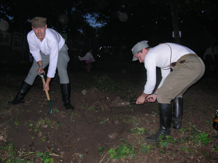 Rekonstruktorzy „Osiemnastego Kołobrzeskiego” dotarli do podgostyńskiego folwarku Podrzecze w piątek wieczorem. Do tego okazało się, że kłopoty z dojazdem pozbawiły nas niemal połowy planowanego stanu osobowego. Na miejscu, po zapoznaniu się z przeznaczoną dla nas lokalizacją stwierdziliśmy, że jest ona bardzo dobra – w zasadzie na wprost wejścia na teren zlotu, u zbiegu dwóch głównych tras komunikacyjnych. Niestety, możliwości w stworzeniu dioramy mieliśmy więcej niż skromne. Jako pierwszy stanął przepisowy namiot z czterech płaszczy-namiotów, wyłożony słomą. Następnie zabraliśmy się za kopanie okopu – stanowiska obserwacyjnego. Zapadł zmierzch i większość prac musiała zostać wykonana przy świeczce i to saperkami. Z lekką zazdrością patrzyliśmy na porządne, pełnoprofilowe okopy sąsiadów, wykopane koparką i oszalowane drewnem. W porównaniu z tymi umocnieniami nasz mikro-dołek wyglądał raczej smutno. Było już dobrze po północy, kiedy – po wizycie na klimatycznej imprezie w wietnamskiej bazie Amerykanów – położyliśmy się spać.
