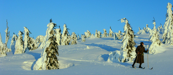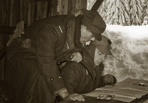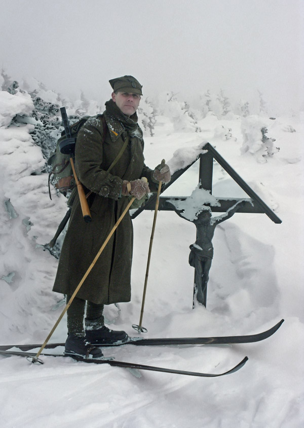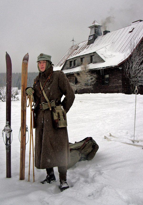 Pierwsze kilometry marszu na nartach przebiegły z pewną ostrożnością, spowodowaną lekkim brakiem zaufania do kilkudziesięcioletnich, drewnianych nart. Okazało się jednak, że tradycyjny sprzęt znakomicie sprawdza się zarówno na przetartych ścieżkach, jak i w kopnym śniegu. Jedynym problemem były strome podejścia, które trzeba było pokonywać jodełką. Zdecydowaliśmy się zatem na wyjście w najwyższe rejony Gór Izerskich – Wysoki Grzbiet. Szybko zachodzące słońce oświetlało purpurową łuną zmrożony śnieg i całkowicie oblepione szadzią świerki. Dookoła roztaczała się piękna panorama Gór Izerskich i Karkonoszy, a bezchmurne niebo i wyjątkowo przejrzyste powietrze pozwalało dostrzec nawet najdrobniejsze szczegóły. Niestety, taka pogoda niesie za sobą bardzo silny mróz, temperatura spadała z każdą chwilą. Planując zajęcia przewidywałem nocleg w terenie przygodnym, jednakże uwzględniając prognozę pogody oraz zmierzoną temperaturę (która przekroczyła wczesnym popołudniem minus 18 stopni) podjąłem decyzję o zejściu do schroniska. Oczywiście, zrobiłem to z pewnym żalem i poczuciem porażki. Niestety, aby przetrwać noc bez współczesnego sprzętu biwakowego konieczne byłoby utrzymywanie stale płonącego ogniska. W tych warunkach terenowych trzeba by wyciąć kilka sporych drzew – chociażby po to, aby wyłożyć gałęziami miejsce odpoczynku i zapewnić sobie opał. Rekonstrukcja to jednak nie wojna i nie mogliśmy dla zabawy trzebić i tak już ciężko doświadczonych izerskich lasów. Rozpoczęliśmy długie zejście w kierunku Hali Izerskiej. Tymczasem słońce zaszło, a mróz przybierał na sile. Chłód przenikał przez płaszcze i drelichowe mundury, bolały stopy, piekły policzki, traciliśmy czucie w palcach rąk. Gdy w końcu dotarliśmy do schroniska, na wywieszonym przy drzwiach termometrze było minus 28 stopni. Rozmowa z gospodynią przekonała mnie, że rezygnacja z bytowania była rozsądna – poprzedniej nocy zanotowano tam 42 stopnie mrozu. Zjedliśmy swoją rekonstrukcyjną kolację w postaci ciemnego chleba z wędzoną słoniną i cebulą, popiliśmy herbatą z wojennych kubków. Nocleg też był rekonstrukcyjny – ot, nakryć się płaszczem i podłożyć pod głowę zwinięty płaszcz-namiot.