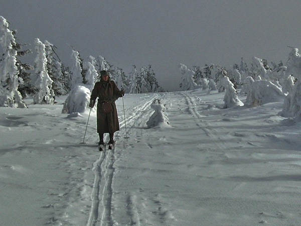 Kolejny dzień powitał nas silnym wiatrem i drobnym śniegiem. Trochę ocieplało, na termometrze jedynie minus 18 stopni. Wyszliśmy długim łagodnym podejściem kierując się na kolejny masyw – tym razem graniczną górę Smrek. Po kilku godzinach marszu zatrzymujemy się w zagłębieniu pod świerkami, chroniąc się nieco przed wiatrem i próbując coś zjeść. Znajduję sterczący uschły pieniek i odłupuję od niego kilka szczap, ale drewno jest oblepione szadzią, nasiąknięte i zmrożone. Nie udaje się zagotować wody, musimy zadowolić się kilkoma sucharami i plastrem słoniny. Popijamy wodą z manierek, przenoszonych za pazuchą płaszczy. Odpoczynek nie może trwać długo, już po kilkunastu minutach zaczyna się robić naprawdę zimno – jesteśmy na wysokości około 1000 metrów i temperatura spada do minus 24 stopni. Wychodzimy w rejon podszczytowy Smreka, na przemian pojawia się mroźna mgła i drobny śnieg. Wreszcie osiągamy wierzchołek i wykonujemy kilka pętli wokół niego. W zasadzie nie ma czego obserwować, szczyt spowijają chmury, z których sypie śnieg, ślady są stare i zawiane, wokół cisza, pustka i mróz.