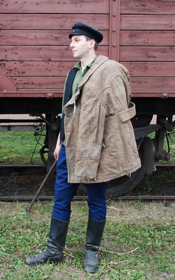 Jego ubiór stanowi typowa dla robotników kolejowych mieszanka – nieregulaminowa czapka w kolorze bardzo ciemnego granatu z lamówką w takim samym kolorze (jak wiele czapek kolejarskich z lat 30. I 40. ta jest tak ciemna, że wydaje się czarna), na której obowiązujący do 1943r. emblemat w postaci czerwonej gwiazdy z wizerunkiem nadjeżdżającego parowozu zamieniono na nowy zestaw oznak – skrzyżowany klucz i młotek (do tej pory występujący tylko na korpusówkach i guzikach kolejarskich) oraz umieszczoną wyżej małą gwiazdkę z sierpem i młotem – identyczną jak stosowana w Armii Czerwonej. Spodnie to wprowadzone w 1932r. spodnie do butów w kolorze granatowym – wyjątkowo nawet w poprawnym, regulaminowym odcieniu granatu. Buty to typowe oficerki ze skóry juchtowej wzoru wojskowego wydawane kolejarzom z powodu niedoboru regulaminowych oficerek z gładkiej skóry. Zielona koszula w tradycyjnym kroju to element cywilny, podobnie jak ciemnogranatowa kamizelka. Pas główny typu oficerskiego stanowi nie do końca zgodny z regulaminem element umundurowania – wedle regulaminów przysługiwał starszym stanowiskiem (szeregowym pracownikom przysługiwał pas identyczny jak szeregowym w Armii Czerwonej). Na kamizelce widoczna jest odznaka członka Komsomołu – wstąpienie do młodzieżówki było znacznie prostsze niż do partii, a w podobnym stopniu ułatwiało życie i poprawiało możliwości awansu. Jako wierzchnie okrycie robotnik wykorzystuje mocno wysłużoną watowaną kurtkę dwurzędową typu wojskowego – pochodzącą prawdopodobnie z tego samego źródła co większość wydawanej robotnikom przemysłowym odzieży zimowej – z frontowego odzysku – stąd liczne uszkodzenia naprawione byle jak widoczne na tej kurtce. Robotnik wykorzystuje typowy młotek rewizyjny do sprawdzenia działania hamulców w kołach wagonów skierowanych na remont – tu akurat zdobycznych wagonów niemieckich (jak wspomniano, w 1945r. wiele torów na terenie Ukranińskiej SRR funkcjonowało jeszcze w rozstawie europejskim, co umożliwiało wykorzystywanie na tym obszarze niemieckiego taboru).