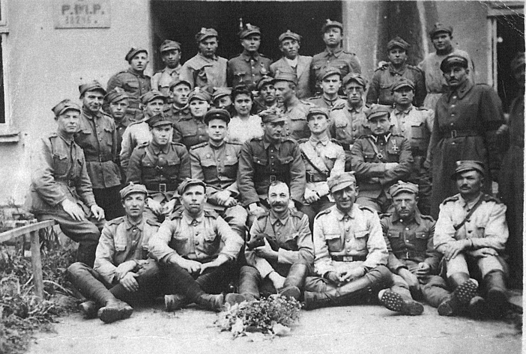 Zdj. 4 – Grupa żołnierzy 16pp (i oficer radziecki). W ostatnim rzędzie, w cywilnej marynarce (wspomniany w tekście) weteran, dla którego munduru zabrakło ze względu na niski wzrost. Warto także zwrócić uwagę na niemieckie trzewiki u siedzących, sztylpy (pochodzenia niemieckiego lub radzieckiego) u trzeciego po prawej w pierwszym rzędzie, a także na rozmaitość pasów (w tym niemieckie) i kolorów mundurów. Zwracają też uwagę patki typu przedwojennego u oficera z Krzyżem Walecznych. Lato 1944r. Zdjęcie ze zbiorów rodziny weterana.