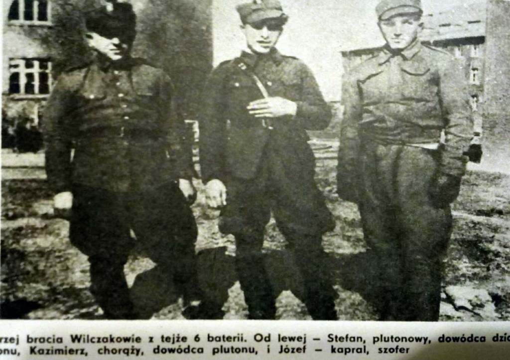 Zdj. 13 – Przykład innego pochodzenia mundurów – trzej bracia Wilczakowie. kpr. Józef Wilczak – szofer – pozuje w battledressie. Co ciekawy, nie jest to jedyny znany przypadek stosowania battledressów przez szoferów 1AWP. (“Na drodze stał Kołobrzeg”)