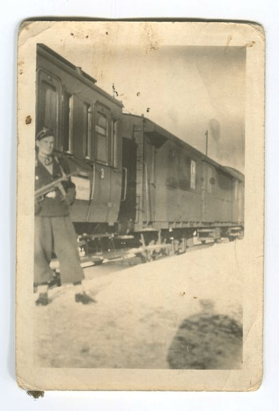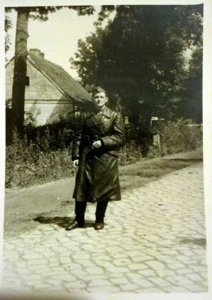 Zdj. 16 – …Ale chętnie był przyswajany przez niższe szarże. Na zdjęciu, w podobnym płaszczu skórzanym Jerzy Olszewski w czasie służby w stopniu oficerskim (chorążego lub podporucznika) w 2AWP lub WOP, zdjęcie wykonano pomiędzy listopadem 1944r. a sierpniem 1946r. Zdjęcie ze zbiorów autora.