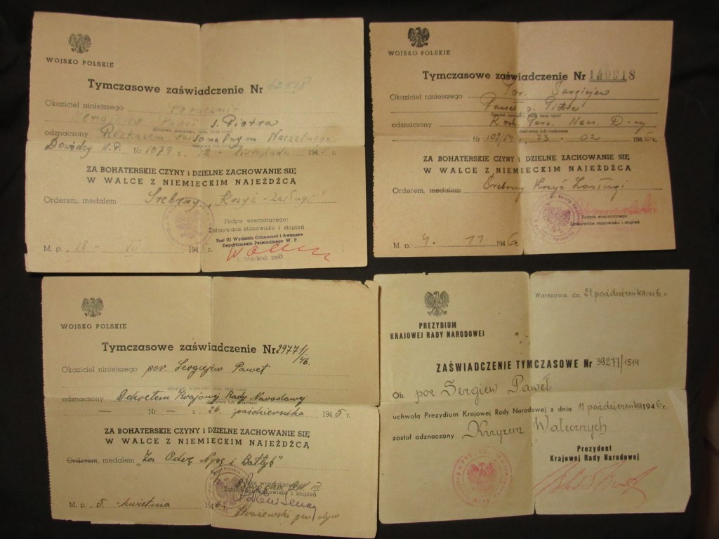 11października 1946r. odznaczony został Krzyżem Walecznych – trudno powiedzieć, czy za czyny w czasie wojny, czy już za działania w szeregach WOP. Natomiast 4 listopada dogonił go drugi Srebrny Krzyż Zasługi – nadany Rozkazem NDWP nr 54 z 23. lutego 1946r. – szerzej o tym rozkazie pisałem w części czwartej niniejszego cyklu.