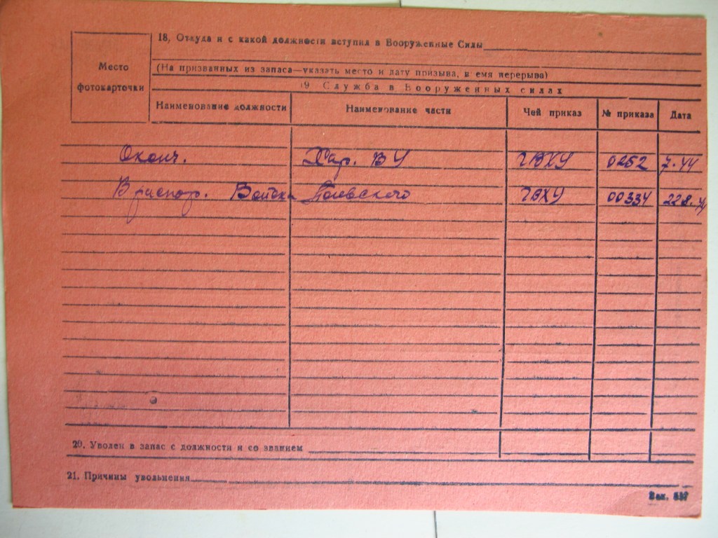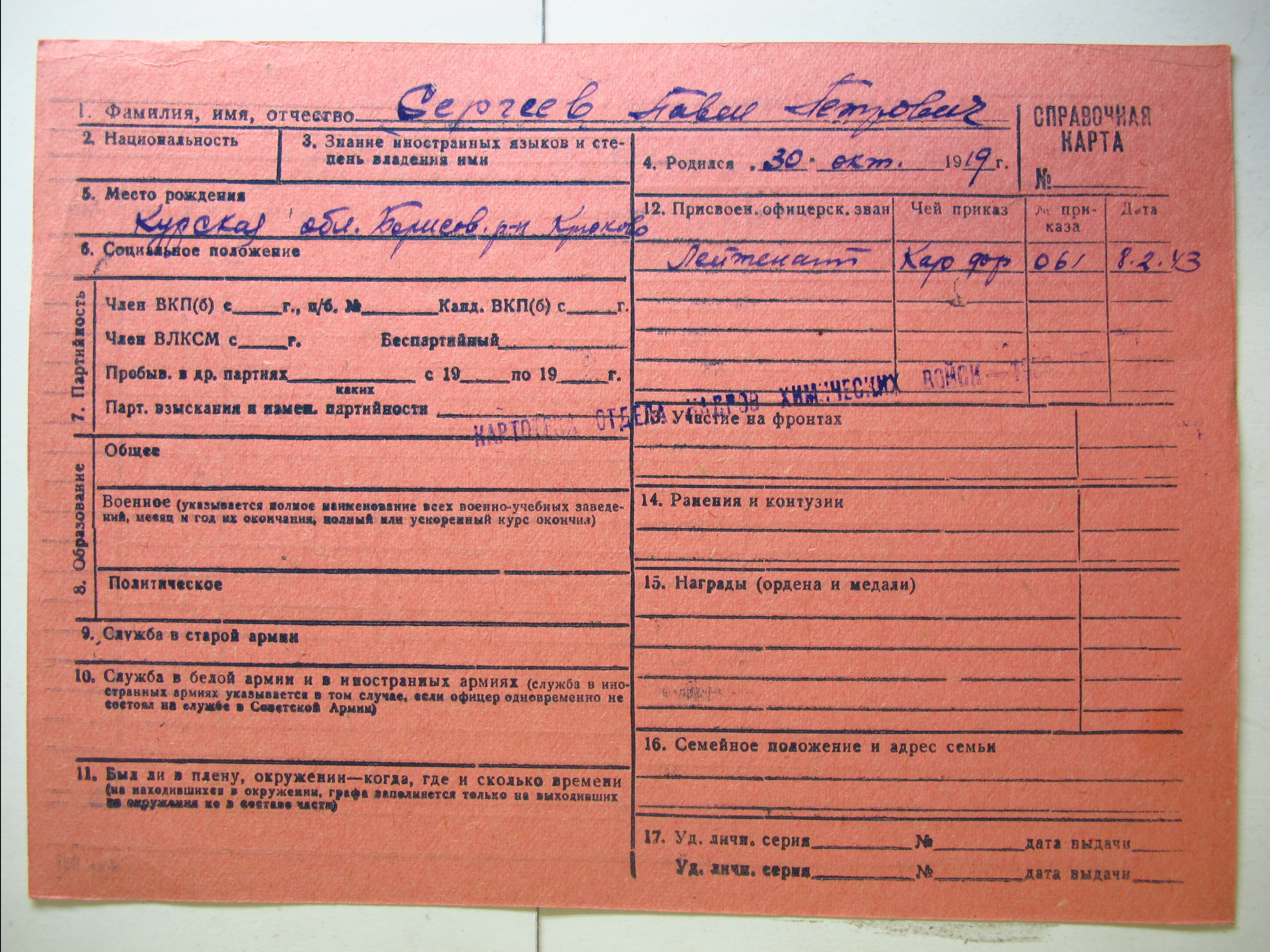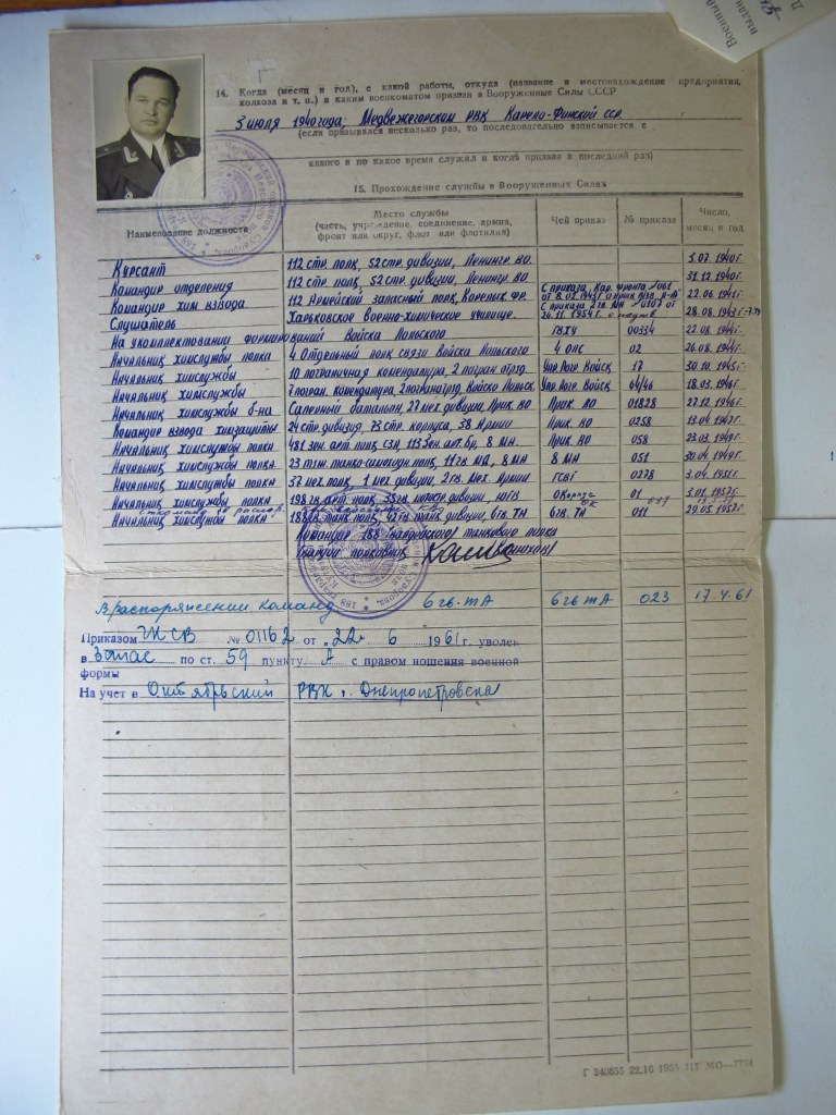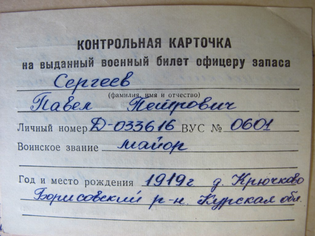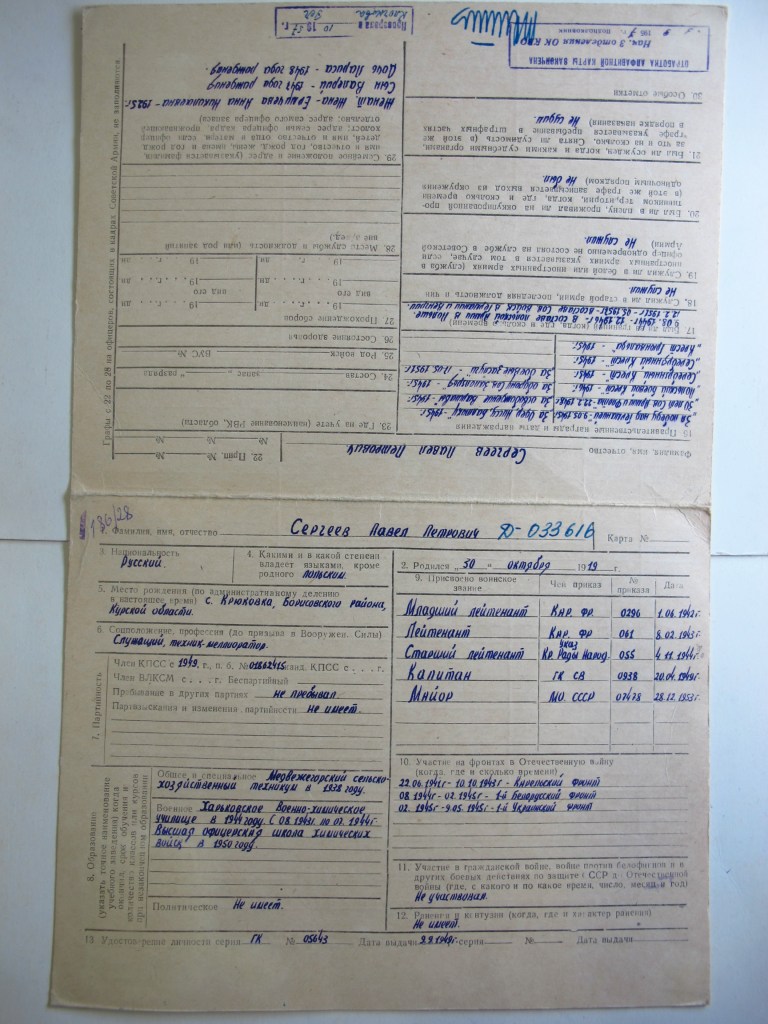 Takim właśnie przypadkiem był Paweł Piotrowicz Siergiejew – szef służby chemicznej 4pł 2AWP. Z Centralnego Archiwum Ministerstwa Obrony Federacji Rosyjskiej udało się uzyskać kopie dwóch arkuszy ewidencyjnych – w tym jedną, niezbyt pomocną, z kartoteki wojsk chemicznych Armii Radzieckiej.