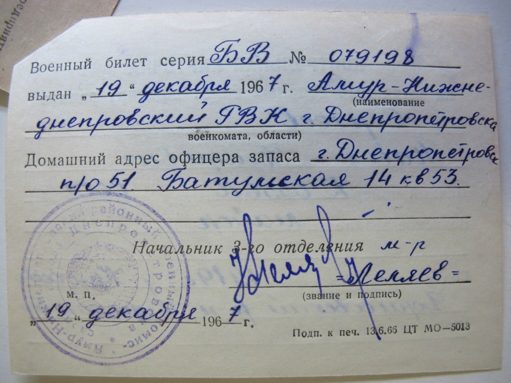 17 kwietnia 1961r.został przekazany do dyspozycji dowództwa 6GAP, a 22 czerwca został zwolniony do rezerwy z prawem noszenia munduru i wciągnięty na ewidencję Oktjabrskiego RWK w Dniepropietrowsku.