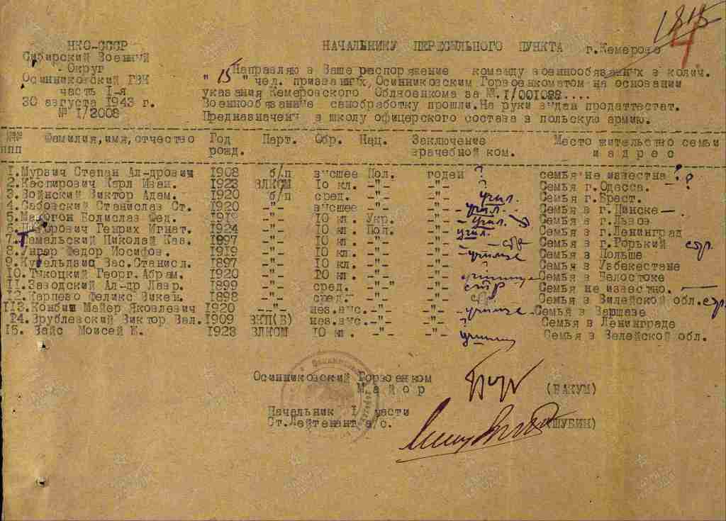 Lista skierowanych do szkół oficerskich żołnierzy Wojska Polskiego. Bolesław Makochan pod nr 5., wpisano mu narodowość ukraińską jako jedynemu z listy. 30.08.1943r. Dokument pochodzi z CA MO RF.
