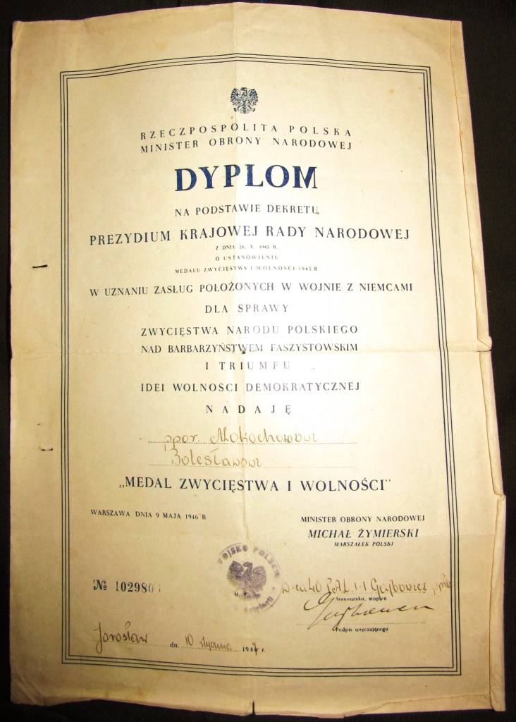 Dyplom medalu “Zwycięstwa i wolności” wystawiony jeszcze w 40PAL