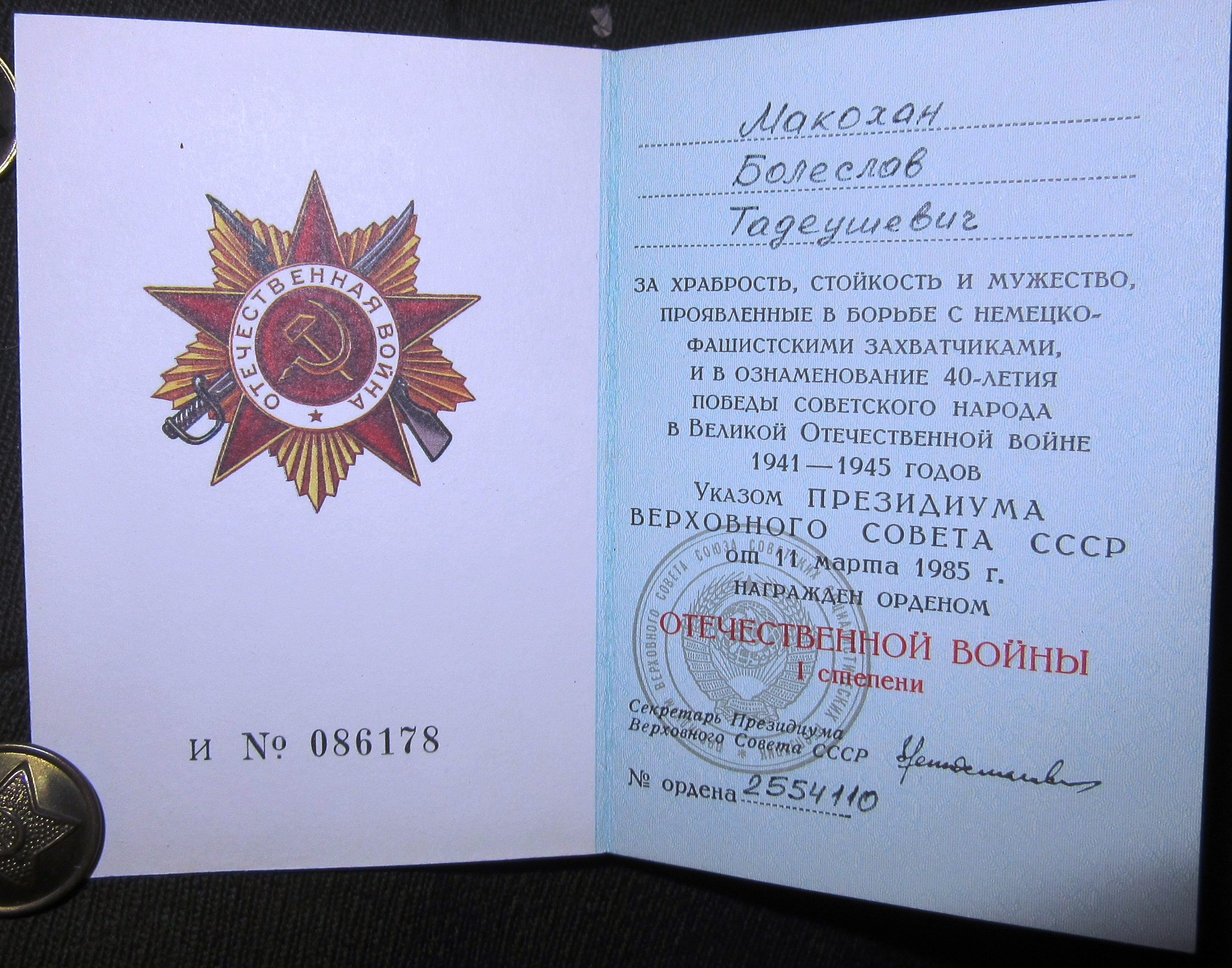 Order Wojny Ojczyźnianej I klasy – 1985r.