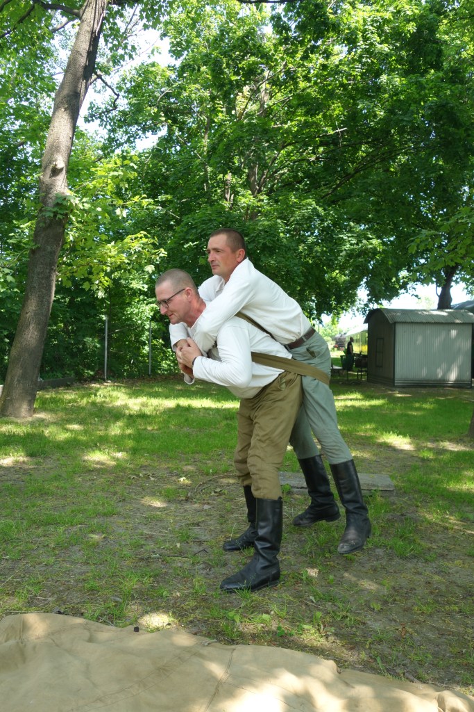 W sobotę od rana zaczęliśmy zajęciami z zakresu ratownictwa medycznego – współczesnego. Choć wielu może się to wydać dziwne, rekonstrukcja historyczna jest aktywnością sprzyjającą rozmaitym urazom. W ramach zajęć przećwiczono więc sposoby postępowania w przypadku ran możliwych do napotkania podczas inscenizacji.