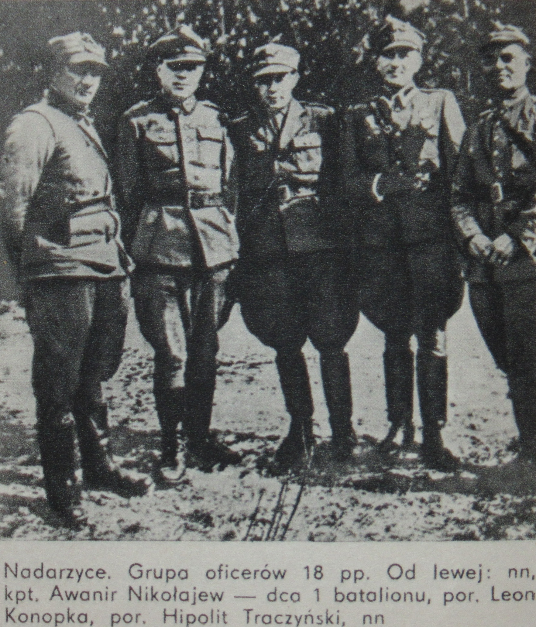 „[przed natarciem na Lobeofsund 29IV1945r.] zanim żołnierze poszli do natarcia, nastąpił taki moment, kiedy na rozkaz nikt się nie podniósł w obawie przed hitlerowskim ogniem. Przed zaległe wpolu kompanie wyszedł wówczas kpt. Awanir Nikołajew wraz z por. Hipolitem Traczyńskim.
