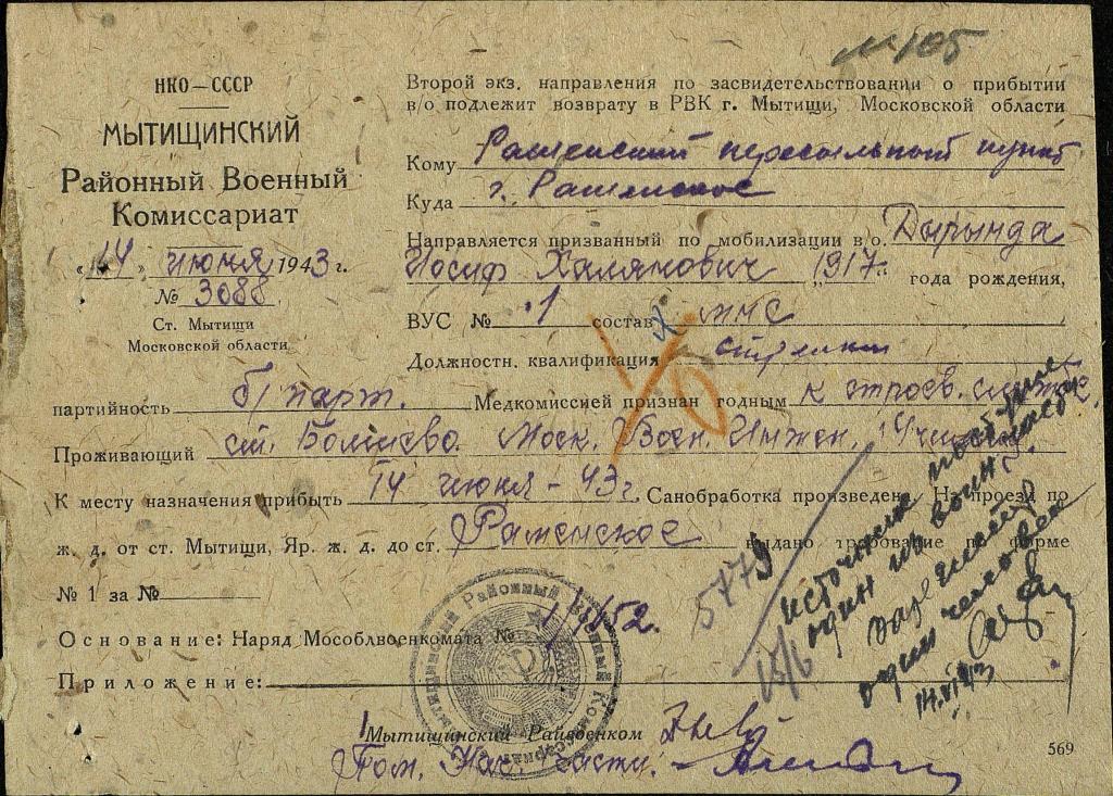 Gdy wiosną dowiedział się o formowaniu 1 Dywizji Piechoty im. Tadeusza Kościuszki, złożył podanie o skierowanie go do polskiego wojska. W tym celu został skierowany do RWK w Mytiszczach. Z badaniem lekarskim w wojenkomacie wiąże się pewna anegdota. Otóż gdy 13.06.1943r. młody podoficer Dyrynda stanął przed komisją w pełnym mundurze, jeden z członków zadał pytanie, dlaczego się nie rozbiera. W odpowiedzi padło: Bo jestem Polakiem! I tak oto młody żołnierz uzyskał na orzeczeniu lekarskim, chyba jako pierwszy w historii, rozpoznanie nieznanej dotąd, nieuleczalnej choroby o podłożu genetycznym: „Polak”.* Oprócz orzeczenia otrzymał także skierowanie do Wojska Polskiego, z pierwszym rozkazem wyjazdu wydanym do miejscowości Ramienskoje, skąd zapewne kontynuował podróż do stacji Diwowo. Kopia rozkazu wyjazdu wystawionego przez Mytiszczński RWK jest jedynym wojennym dokumentem dotyczącym Józefa Dyryndy jaki udało się znaleźć w radzieckich archiwach wojskowych. Dokument ten nosi datę 14.06.1943r., zatem mało prawdopodobne wydaje się, by do Sielc dotarł 15. Czerwca, jak podaje Nowiński.**