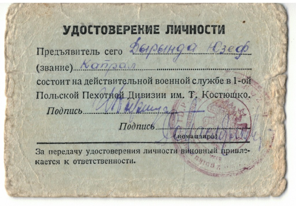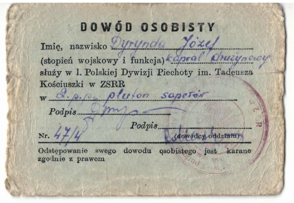 W styczniu 2025 udało się pozyskać dwustronny dowód osobisty Józefa Dyryndy. Stopień i funkcję podano jako “kapral drużynowy”. Nadanie stopnia kaprala byłoby degradacją, dlatego też bardziej prawdopodobne, że zapis ten rozumieć należy jako opis stopnia, wpisany przez kogoś nie zaznajomionego z polskim stopniem plutonowego