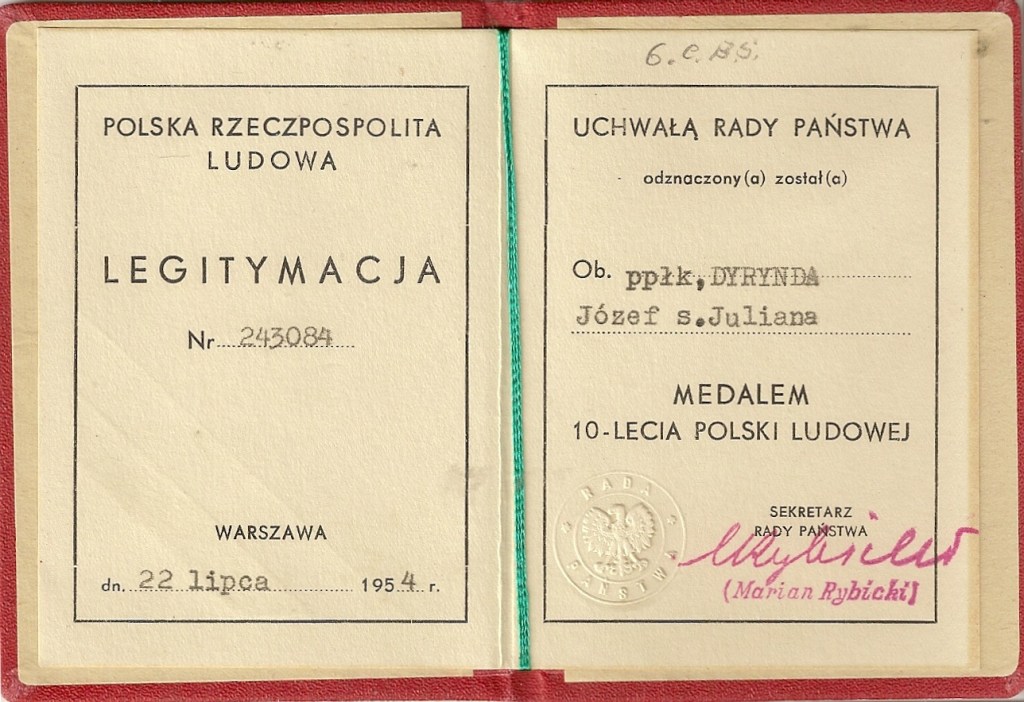 Legitymacja medalu dziesięciolecia Polski Ludowej nadanego ppłk. Dyryndzie jako dowódcy 6CBS