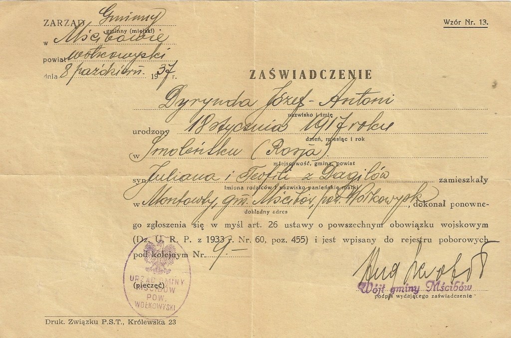 Ta część będzie nieco obszerniejsza. Co prawda poszukiwania w archiwach rosyjskich dały rezultaty wysoce niezadowalające, a do tego w monografii pierwszej jednostki WP do której początkowo trafił bohater niniejszego artykułu nie ma o nim ani słowa, ale ponieważ doszedł on później w Wojsku Polskim do wysokich stanowisk, to doczekał się tekstu poświęconego wyłącznie swojej osobie. Dzięki temu w ten artykuł uda się tchnąć nieco więcej życia niż w poprzednie części. Mamy tu zresztą kolejnu przykład człowieka, który wpisuje się w obie kategorie objęte tym cyklem – polaka zmobilizowanego do Armii Czerwonej i czerwonoarmisty, który na własną prośbę skierowany został do Wojska Polskiego. Zapraszam do lektury.