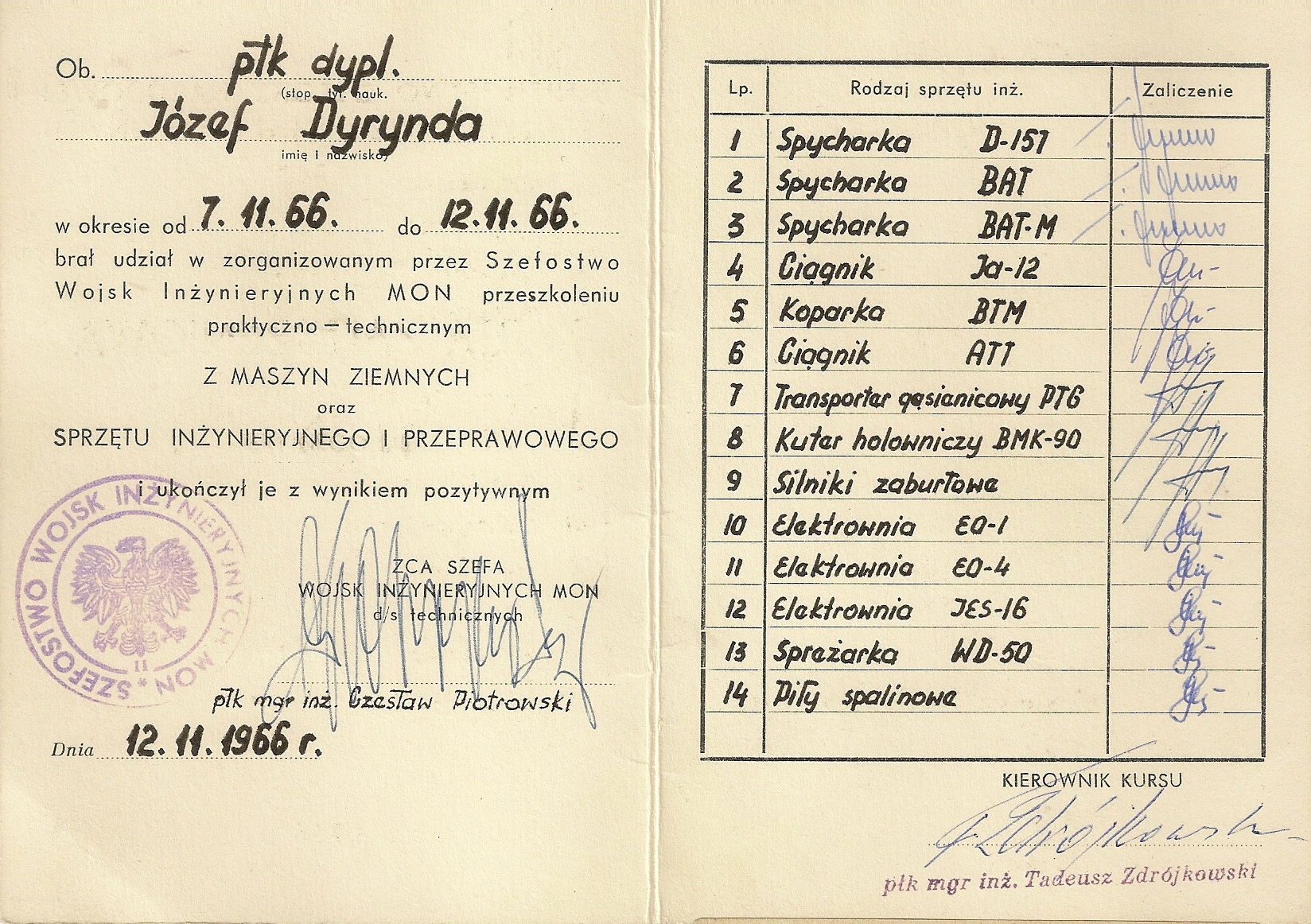 W 1966r. był uczestnikiem przeszkolenia praktyczno-technicznego z zakresu obsługi maszyn ziemnych oraz sprzętu inżynieryjnego i przeprawowego.