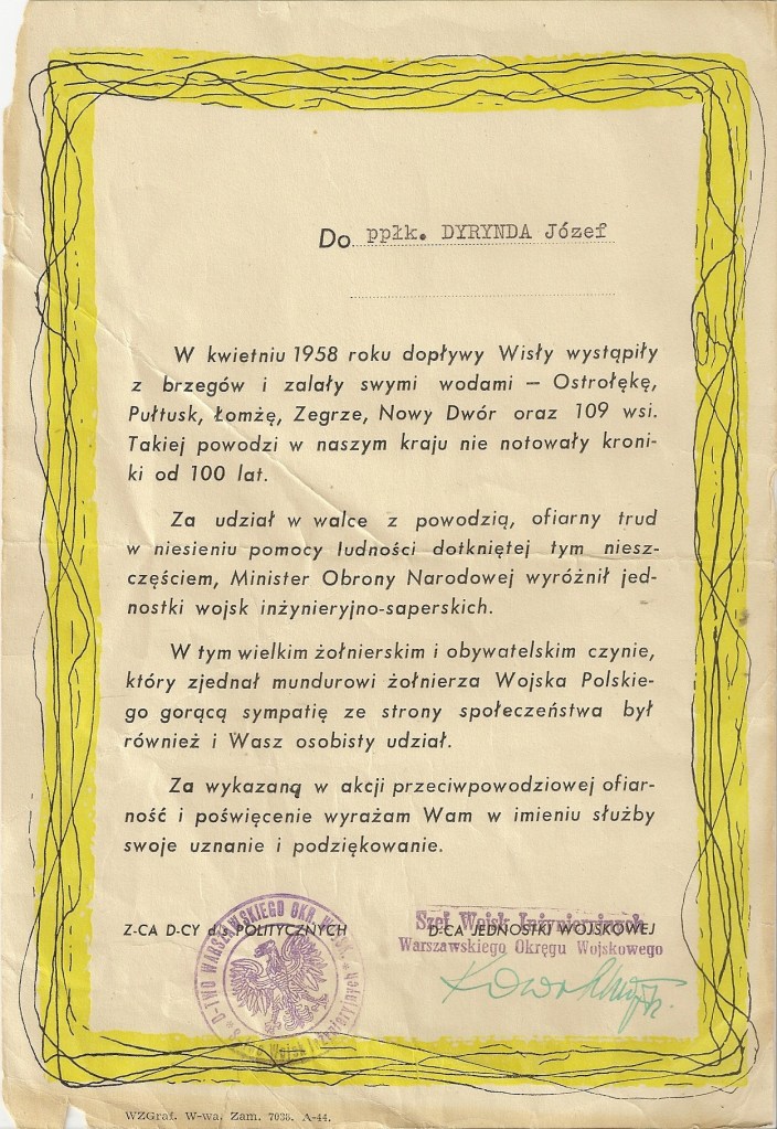 Podziękowanie za udział w akcji przeciwpowodziowj w 1958r.