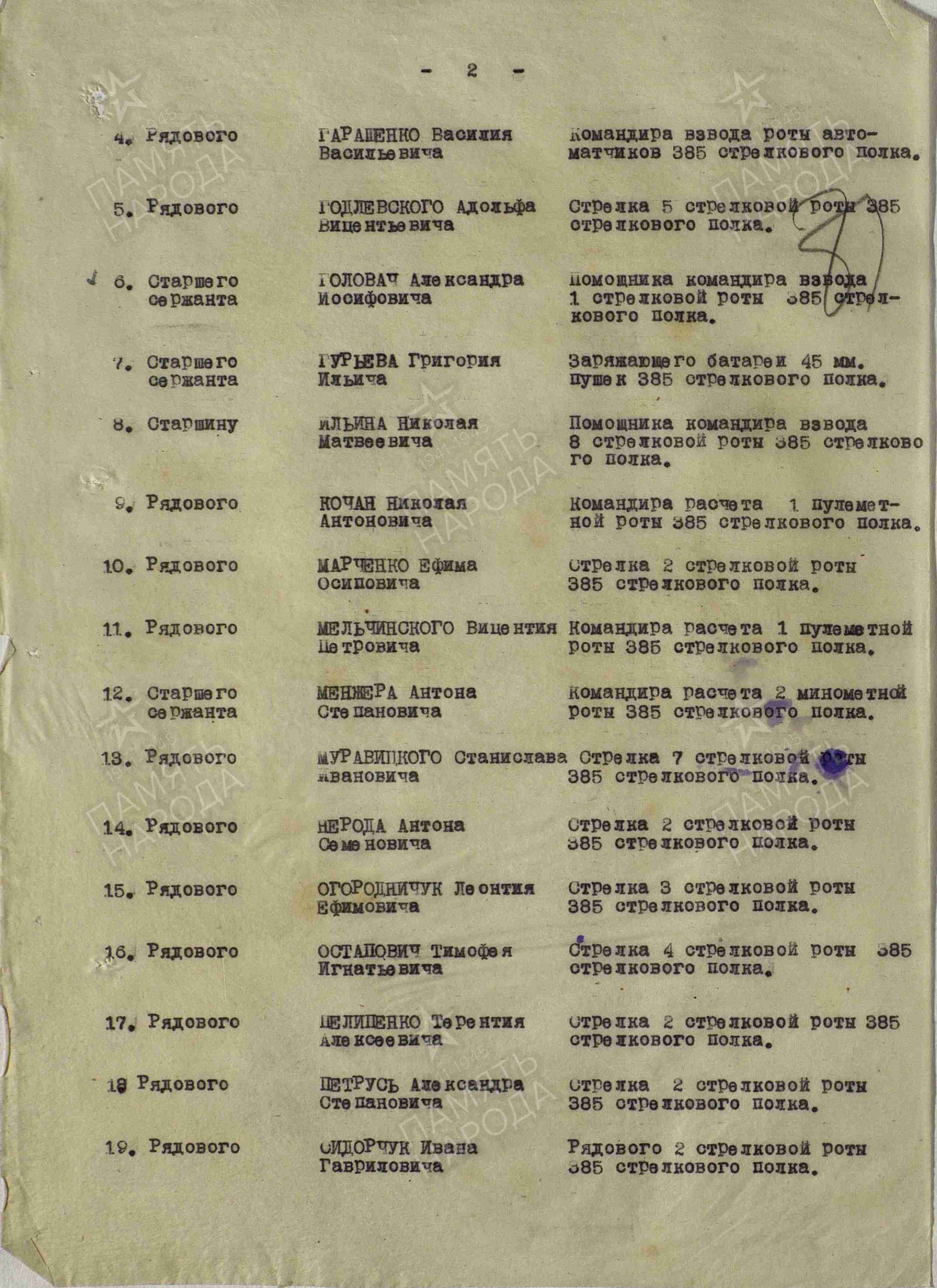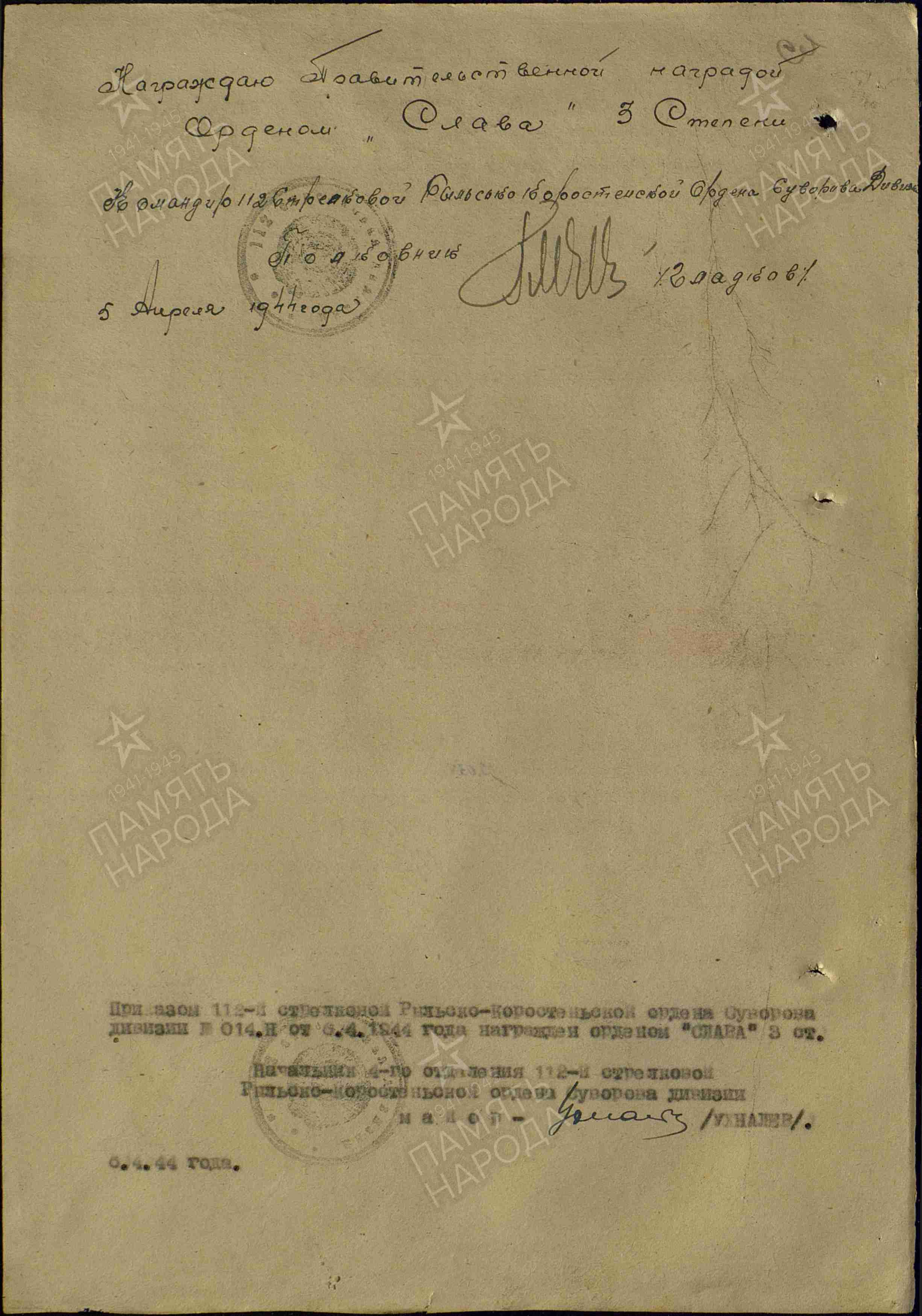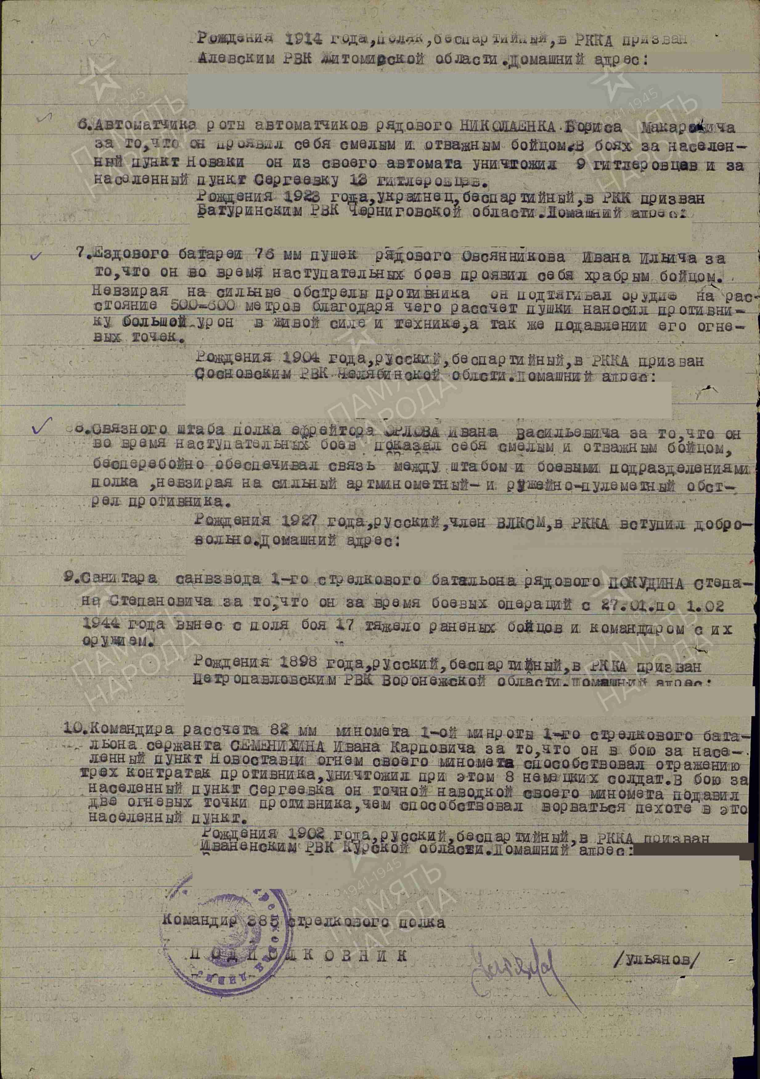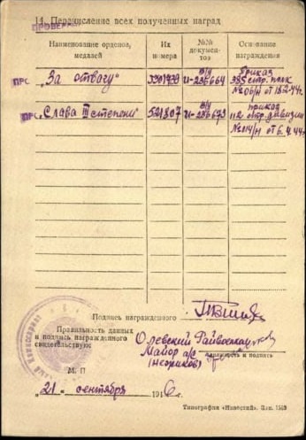 Dowódca pułku, podpułkownik Ulianow wnioskował o nadanie Orderu Czerwonej Gwiazdy, jednak dowódca dywizji, pułkownik Gładkow zmienił rekomendację na Order Chwały III klasy.