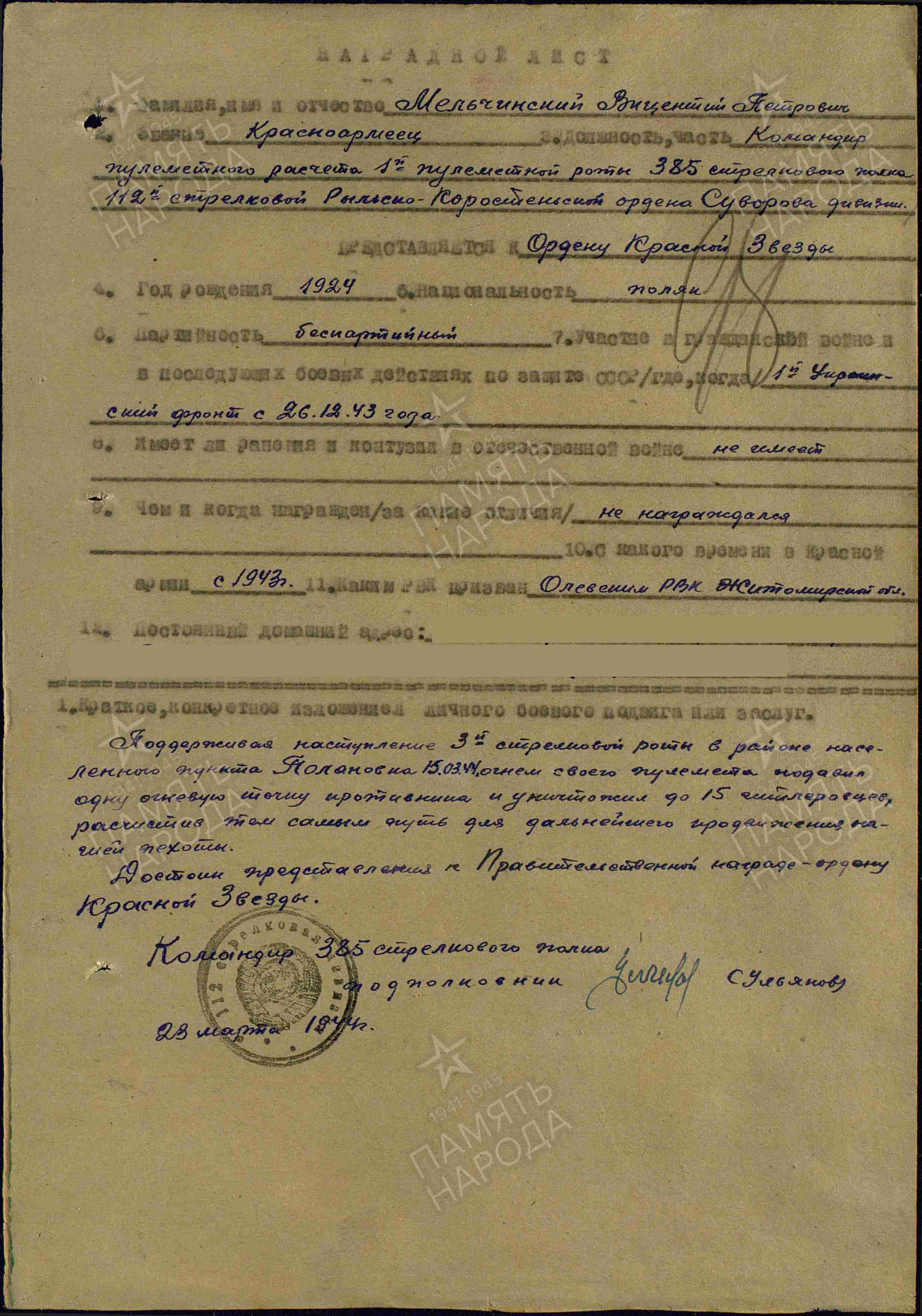 „Wspierając natarcie 3 kompanii strzeleckiej w rejonie osady Połanowka 15.03.1944r. Ogniem swojego karabinu maszynowego zniszczył jeden punkt ogniowy przeciwnika i zniszczył do 15 hitlerowców, otwierając tym samym drogę do dalszego natarcia naszej piechoty”.