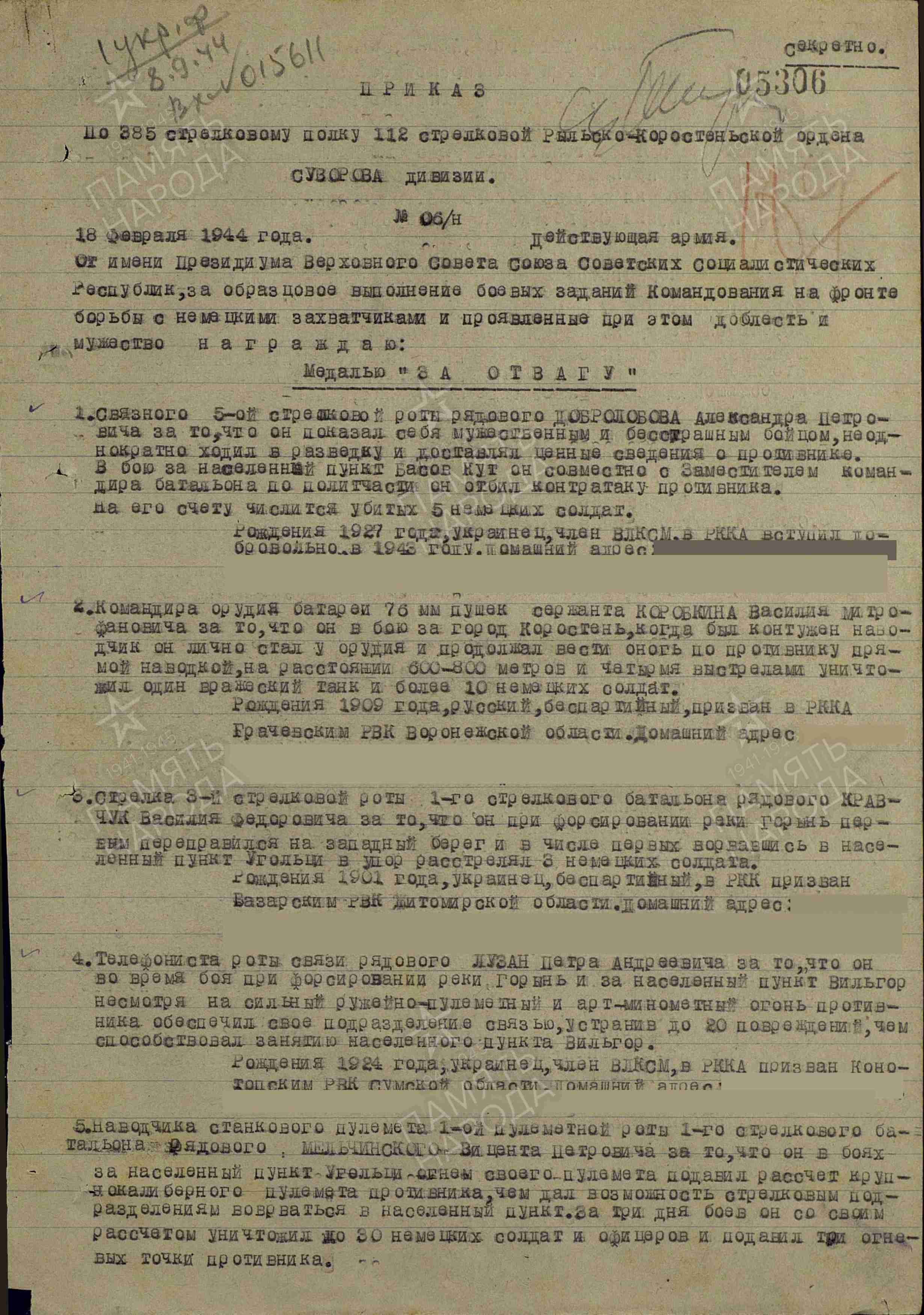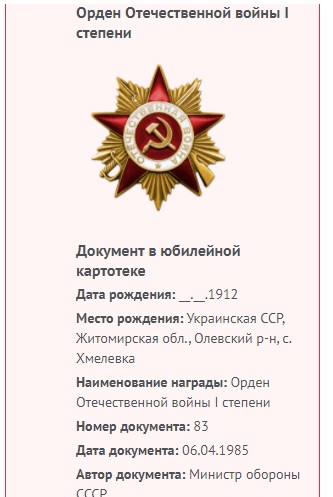 Informacje o odznaczeniu Orderem Wojny Ojczyźnianej I klasy – jako miejsce urodzenia figuruje wieś Chmielowka.