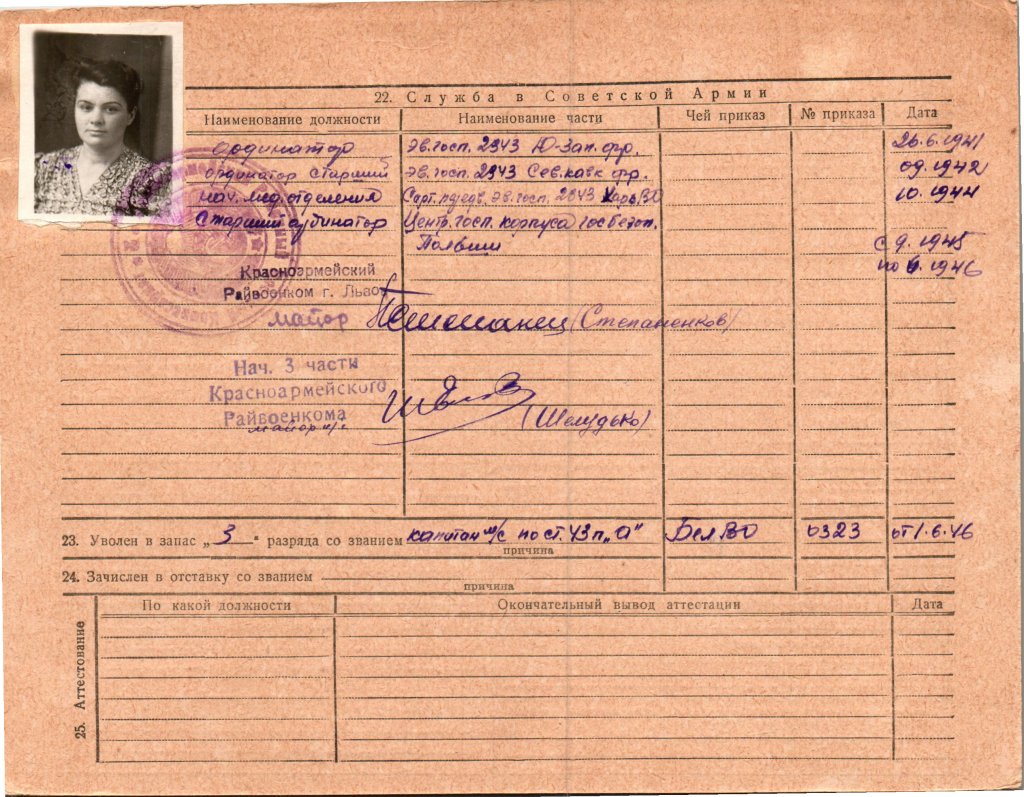 Następnie, arkusz ewidencyjny odnotowuje służbę w punkcie klasyfikacji rannych (dziś powiedzielibyśmy: „triażu”) szpitala nr 2343 w Charkowskim Okręgu Wojskowym jako naczelnik odziału medycznego. Z kolei wystawione w Wojsku Polskim zaświadczenie podaje, że od 20.10.1944r. Służyła w Wojsku Polskim w punkcie ewakuacyjnym nr 8 szpitala ewakuacyjnego nr 2343 I Armii Wojska Polskiego. Wskazywałoby to, ze już wówczas szpital przekazany został pod dowództwo polskie.