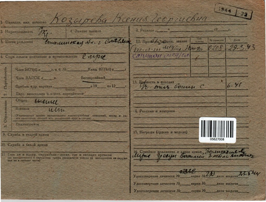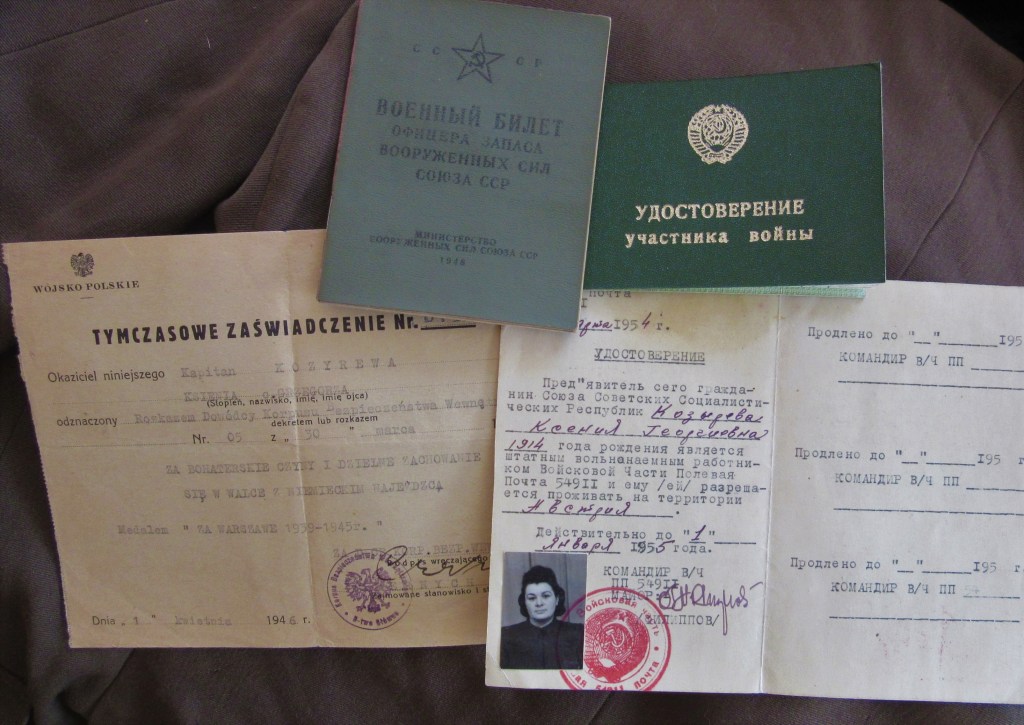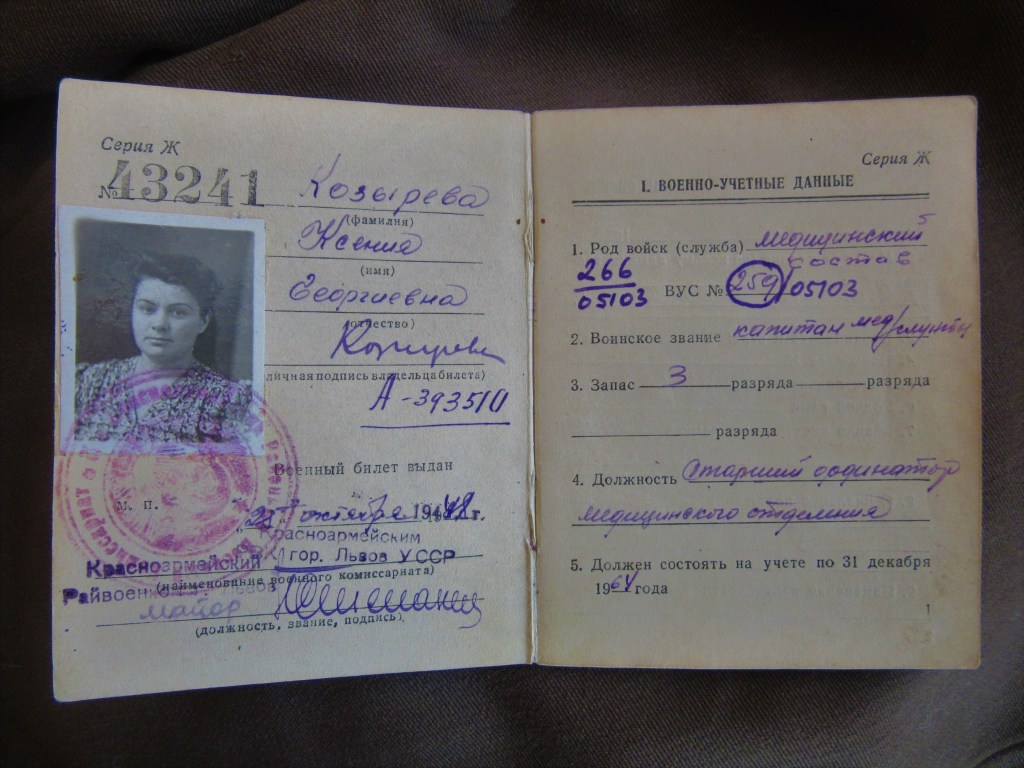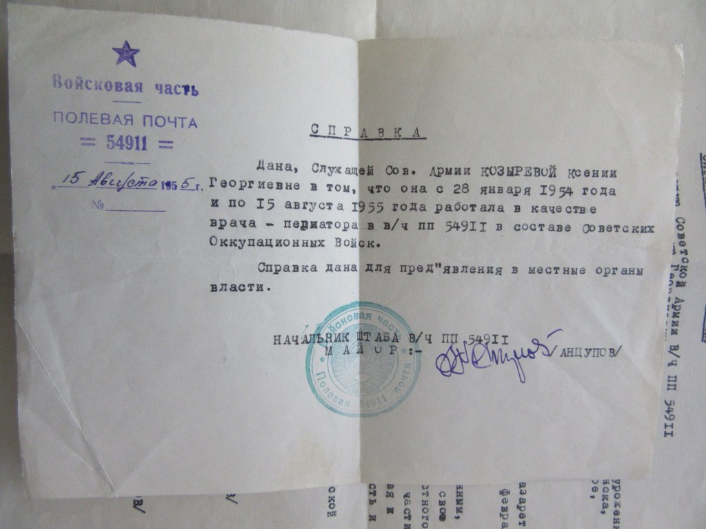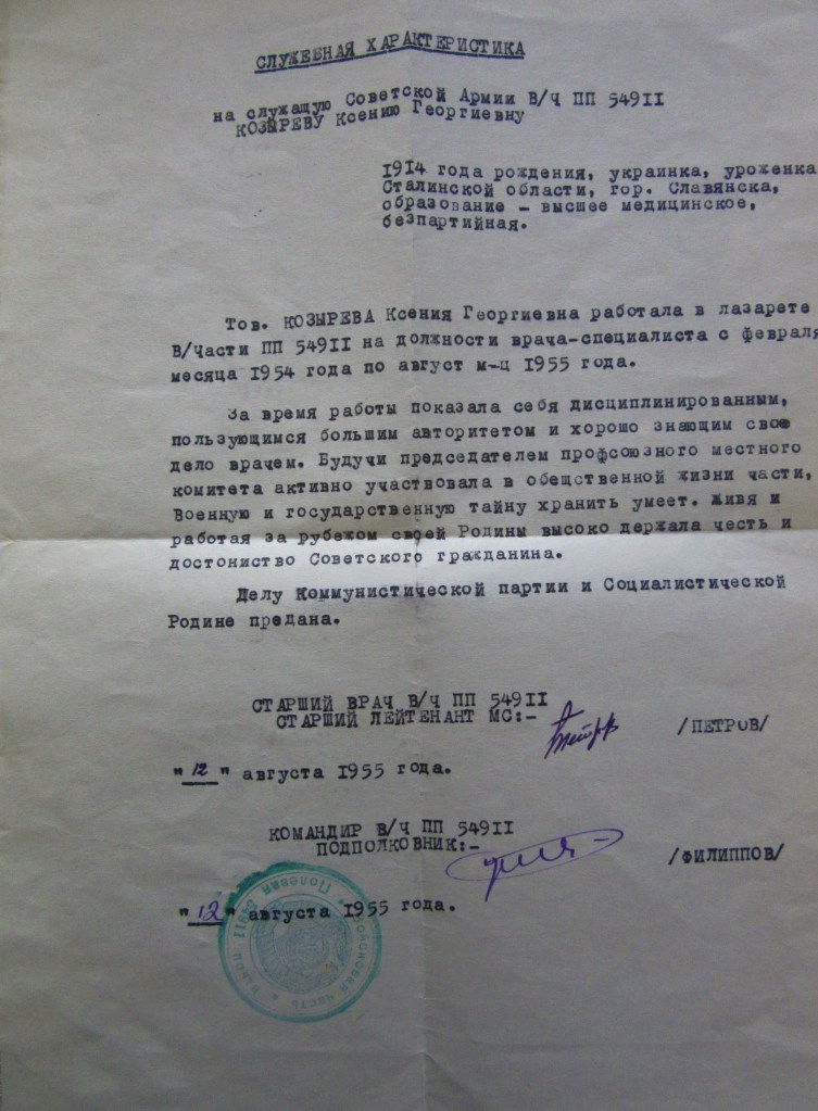 „Tow. Kozyriewa Ksenia Georgijewna pracowała w lazarecie j.w. p[oczta] p[olowa] 54911 na stanowisku lekarza-specjalisty od lutego 1954 roku do sierpnia 1955 roku.
